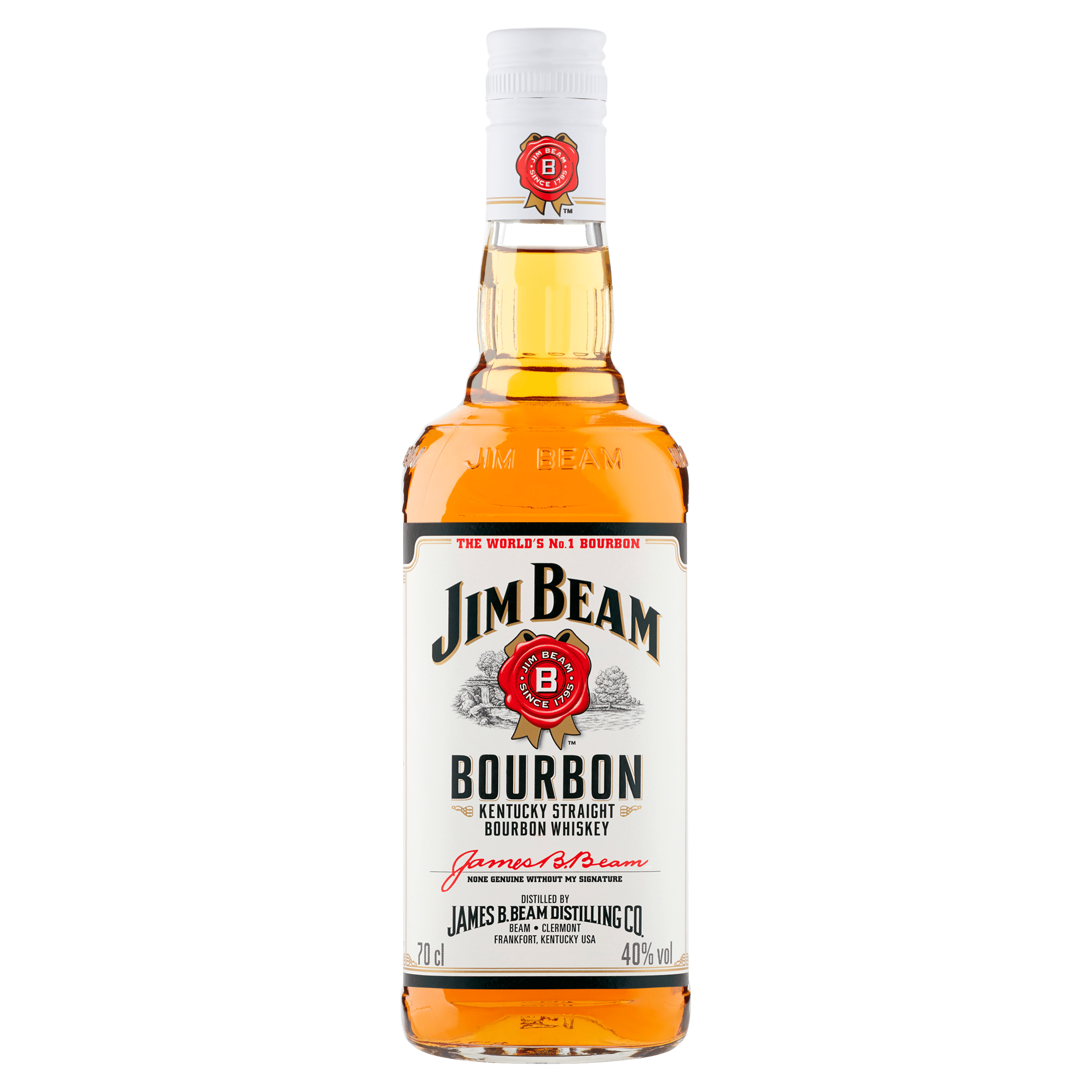 Jim Beam Bourbon is een authentieke Kentucky Straight Bourbon Whiskey met een alcoholpercentage van 40%. Met zijn rijke smaak, die ontstaat door het rijpen in nieuwe eikenhouten vaten, is deze bourbon ideaal voor zowel pure consumptie als in cocktails. Geniet verantwoordelijk van deze volle whiskey!