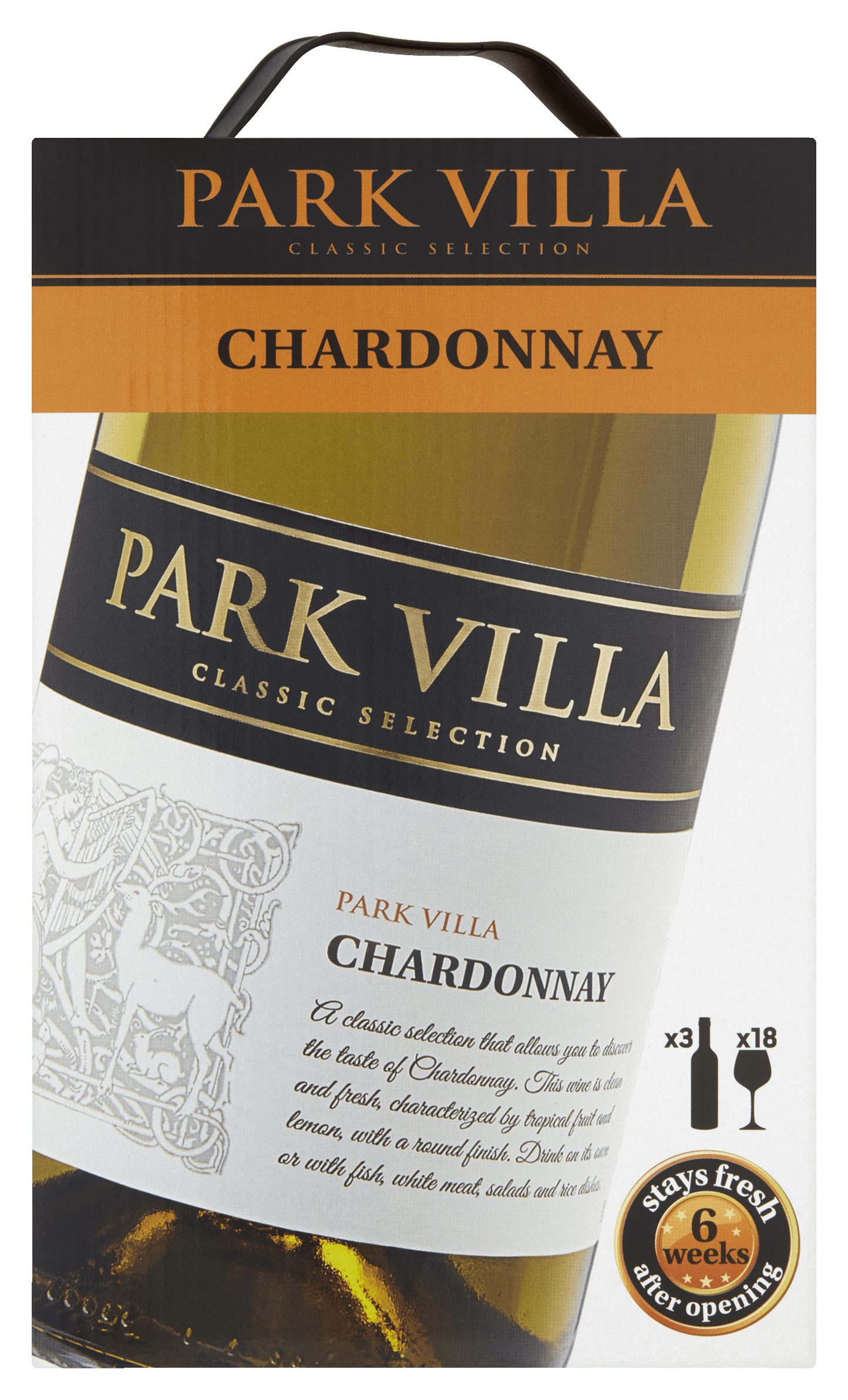 Geniet van de Park Villa Chardonnay, een gedistilleerde witte wijn met een zonnig karakter en uitgesproken smaak. Heerlijke aroma’s van perzik, gele appel en citroen worden aangevuld met tropische hints van ananas, banaan en guave. Deze wijn, geproduceerd door Groupe Grands Chais de France, is perfect voor allerlei gerechten met kip, zalm of vis. Een uitstekende keuze als vollere borrelwijn. Bewaar de wijntap op een koele, droge plek en serveer deze op een temperatuur van ca. 10°C.