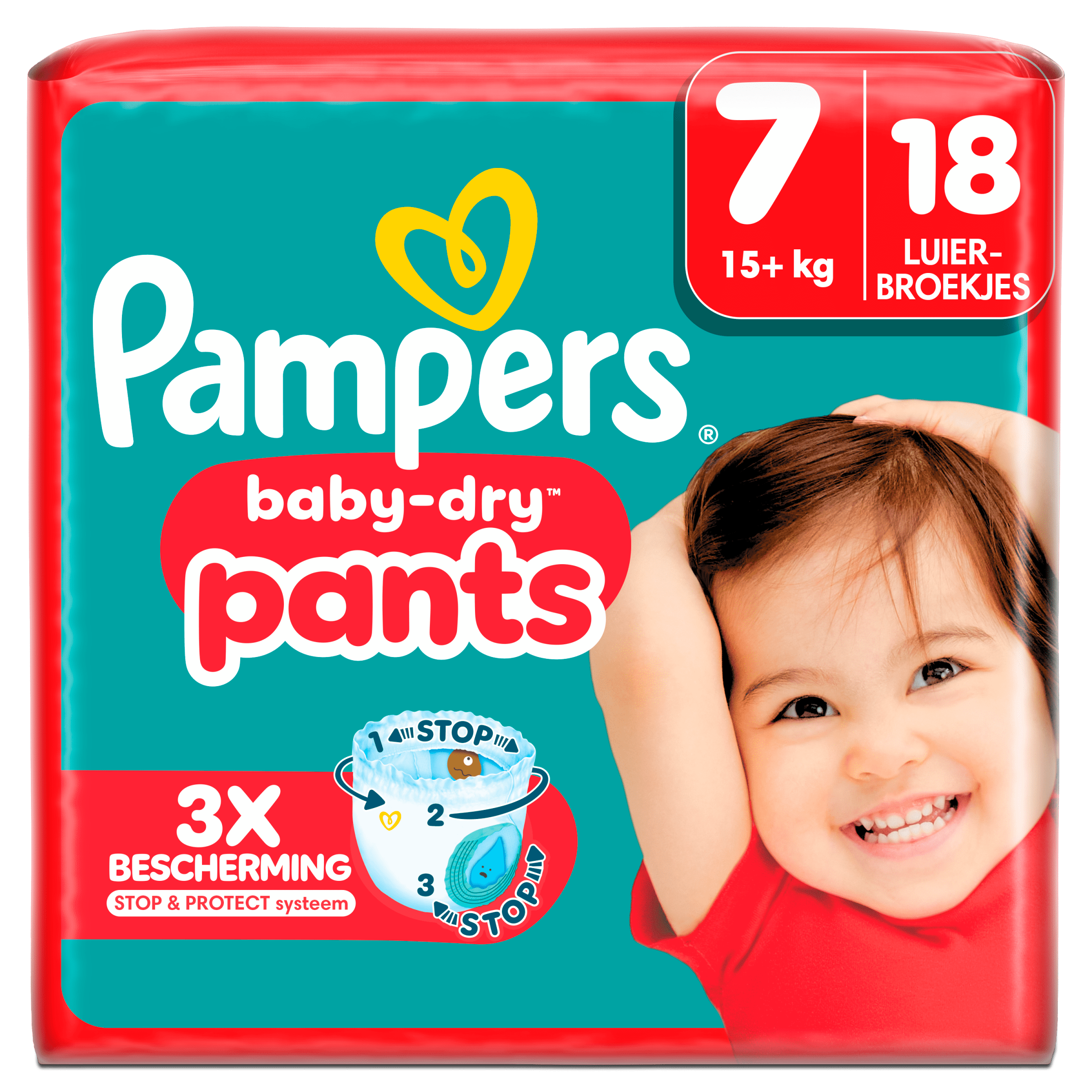 Zorg voor de beste bescherming van je baby met de Pampers Baby-Dry Pants maat 7. Deze unieke luierbroekjes zijn uitgerust met de 3x bescherming technologie, waaronder een Stop & Protect pocket en een 360° rekbare tailleband, die ervoor zorgt dat lekken effectief worden voorkomen. De superabsorberende kern houdt vocht direct vast en de zachte randjes rond de beentjes bieden extra bescherming. Dankzij het eenvoudige en snelle verwisselsysteem zijn deze luierbroekjes ideaal voor actieve baby’s. Dermatologisch getest en vrij van EU-parfumallergenen, zo weet je zeker dat je de beste zorg biedt.