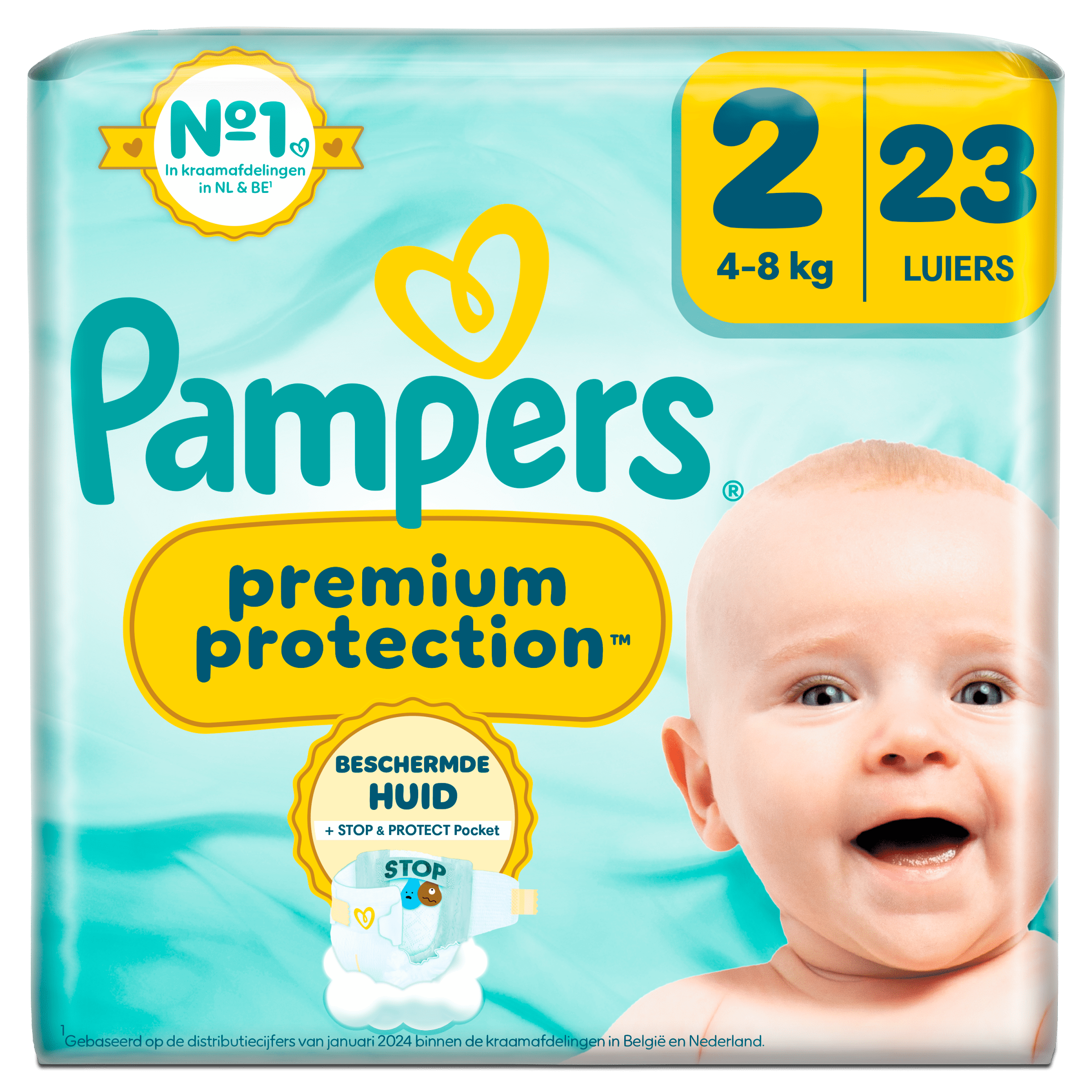 Pampers Premium Protection maat 2 is de N°1 keuze voor de gevoelige huid van pasgeboren baby’s. Met een innovatieve Stop & Protect pocket en miljoenen micro-poriën biedt deze luier onmiddellijke absorptie en optimale bescherming tegen lekken. Ultrafijne materialen zorgen voor comfort, terwijl de dermatologisch goedgekeurde formule veilig is voor de babyhuid. Met een navelvriendelijke uitsparing en overlappende plakstrips is deze luier perfect aangepast aan de lichaamsvorm van je baby.