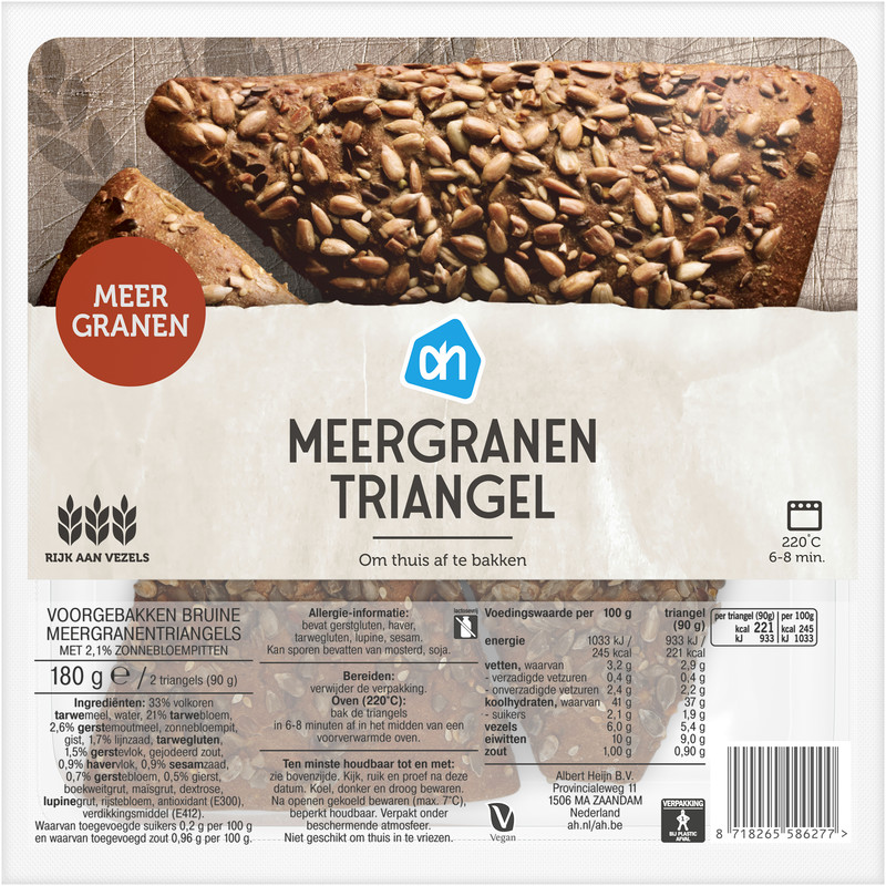 Geniet van de heerlijke AH Meergranen Triangel, voorgebakken en perfect voor een snelle, gezonde lunch. Deze triangel is verrijkt met 2,1% zonnebloempitten en bevat een mix van 33% volkoren tarwemeel en andere voedzame granen, wat zorgt voor een rijke, stevige smaak en een goede voedingswaarde. Rijk aan vezels en vrij van lactose, perfect voor vegetariërs en veganisten. Bak ze thuis af voor een vers, knapperig resultaat en maak je maaltijd compleet!