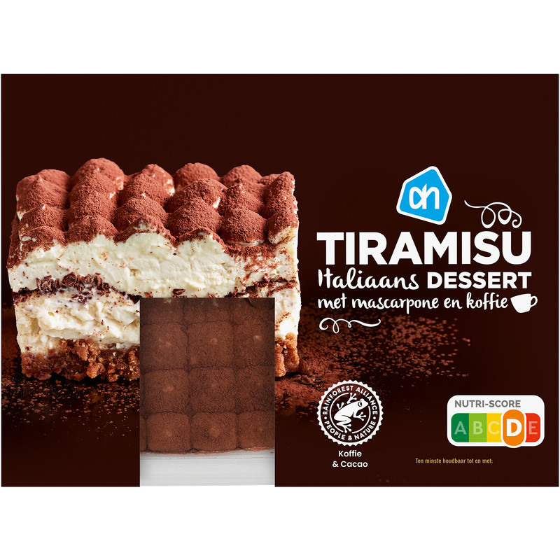 Geniet van de rijke en vol romige smaak van onze AH Tiramisu, een authentiek Italiaans dessert dat al 23 jaar geliefd is. Gemaakt volgens traditionele receptuur met een perfecte combinatie van biscuit, cacao, mascarpone en koffie. Dit Italiaanse lekkernij is ideaal voor een avondje met vrienden of familie en geschikt voor 4 Ã 5 personen. Laat je verleiden door dit klassiek nagerecht, dat gegarandeerd een smakelijk einde aan je maaltijd biedt.
