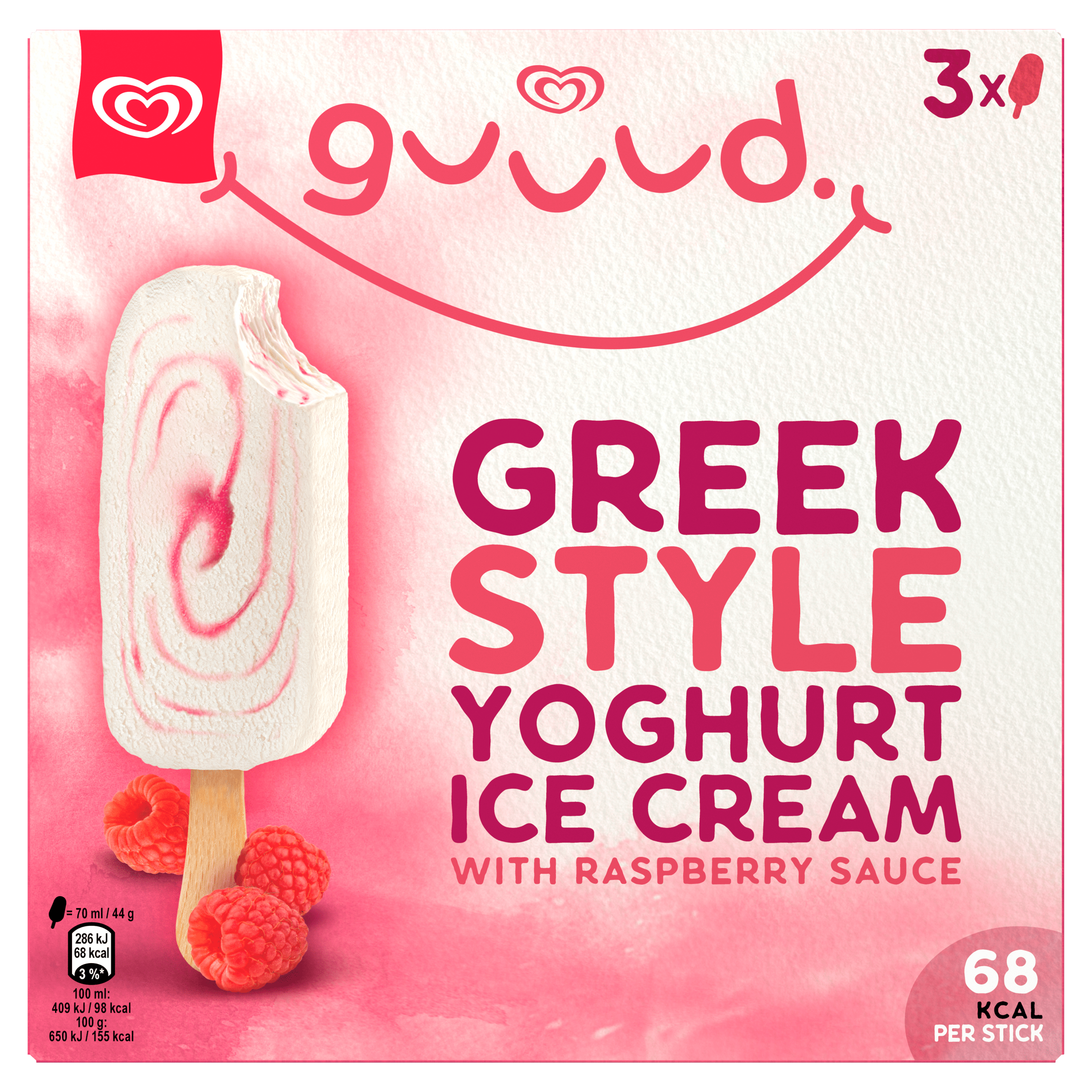 Geniet van de heerlijke Ola Guuud Greek Style Yoghurt Raspberry Stick! Dit romige yoghurtijs is gemaakt met Griekse stijl magere yoghurt en verrijkt met een smaakvolle frambozensaus. Met slechts 68 kilocalorieën per ijsje is het een verfrissende traktatie die je zonder schuldgevoel kunt genieten. Perfect voor warme dagen of als een lichte dessertoptie. Bewaar ze in de vriezer bij -18°C voor een optimale smaakervaring.
