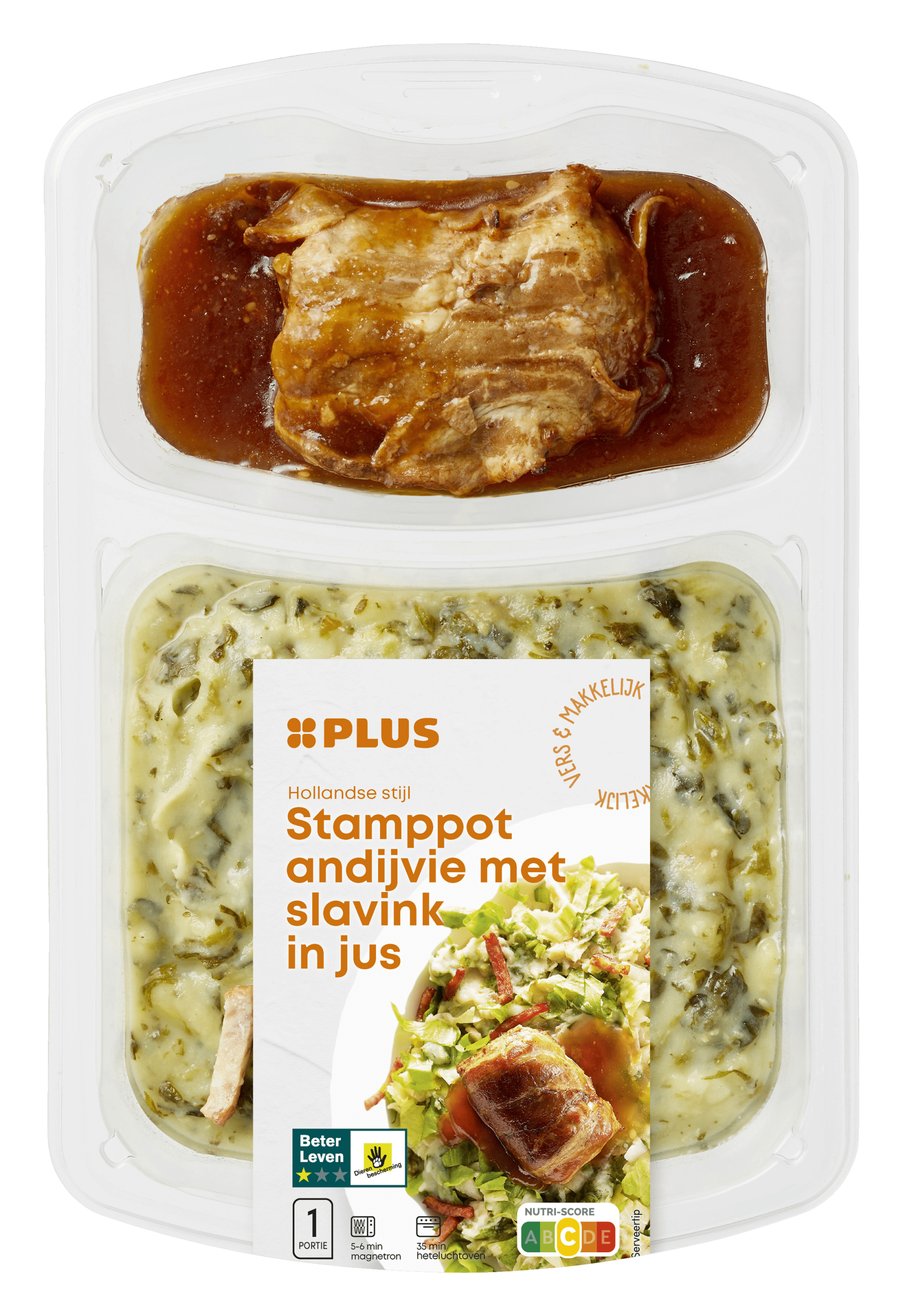 Geniet van een heerlijke PLUS Andijvie stamppot met spekjes en slavink, een veelzijdige maaltijd die snel en gemakkelijk te bereiden is. Deze smakelijke stamppot bevat 70% andijviestamppot, verrijkt met gebakken spekreepjes en een heerlijke slavink in smaakvolle jus. Perfect voor een snelle doordeweekse maaltijd of als comfortfood in het weekend. Met een Beter Leven keurmerk 1 ster en een Nutri-Score C, is dit een verantwoorde keuze voor het hele gezin.