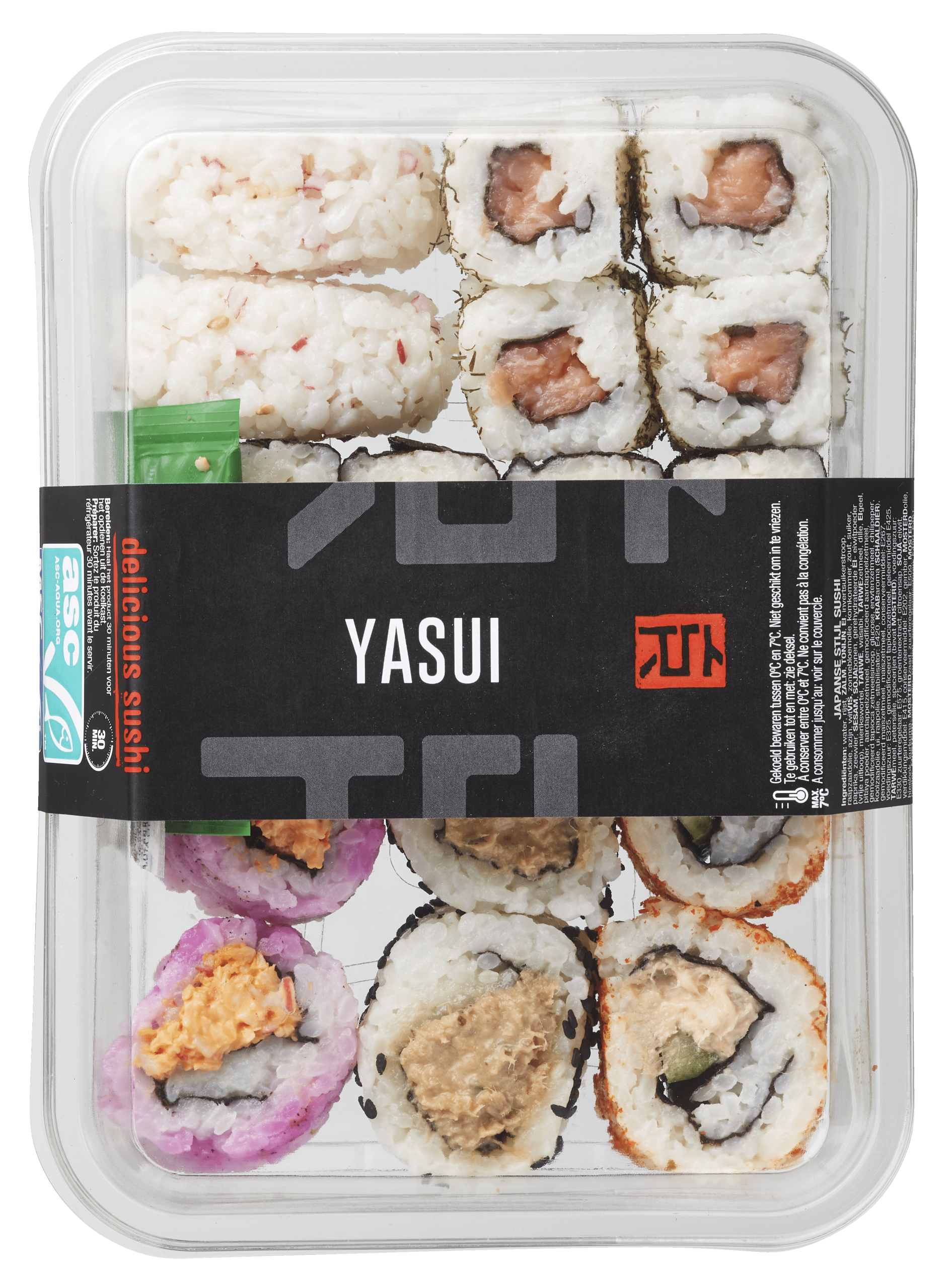 water, rijst, ZALM, TONIJN, EI, invertsuikerstroop, raapzaadolie, azijn, witVIS, zonnebloemolie, komkommer, zout, suiker, paprika, zeewier, SESAM, SOJAbonen, gerehydrateerde EI- eiwitpoeder (vrije uitloop), mierikswortel, TARWE, wasabi, TARWEzetmeel, dille, EIgeel, pitaya poeder, aardappelzetmeel, gemodificeerd aardappelzetmeel, gemodificeerd tapioca zetmeelsiroop, glucose, erwtenzetmeel, chilipeper, koolzaadolie, ui, raapolie, stabilisator: E420, KRABaroma (SCHAALDIER), gemodificeerd maïszetmeel, maïszetmeel, conserveermiddel: E267, voedingszuur: E325, gemodificeerd tapiocazetmeel, geleermiddel: E425, TARWEmeel, peterselie, specerijen (bevat MOSTERD), voedingszuur: E330, zuurteregelaar: E575, groentenextract, citroensap, SOJA-eiwit, verdikkingsmiddel: E415, conserveermiddel: E202, gember, MOSTERDolie, bieslook, kurkuma, MOSTERDzaad, zuurteregelaar: E509, MOSTERD (water, MOSTERDzaad, azijn, kruiden, zout), stabilisatoren: E450, E451, E452, voedingszuur: E300, TARWEbloem, kleurstof: E160d, gist, Japanse peper, yuzu.