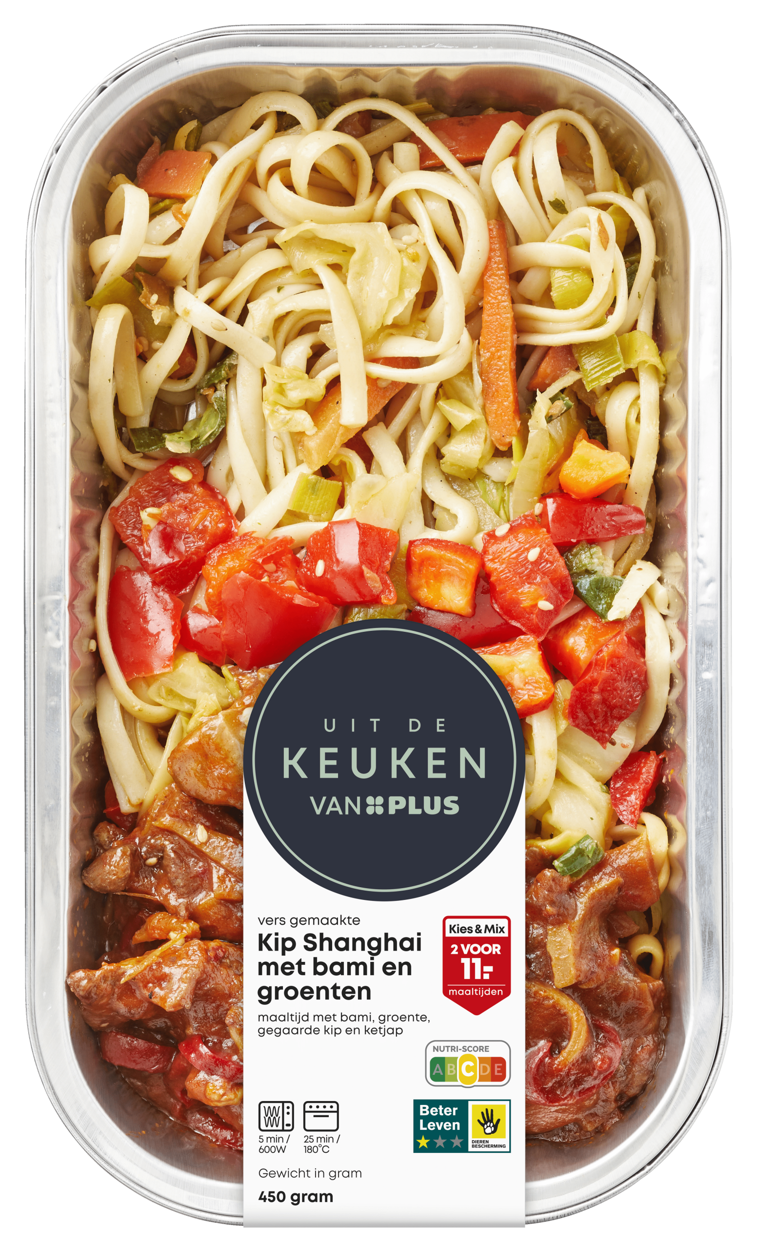 Geniet van een heerlijke maaltijd met de Uit de keuken van PLUS Kip Shanghai. Deze smaakvolle schotel is samengesteld uit 28% gekookte bami, 13% kippenvlees met het Beter Leven 1 Ster keurmerk, en een mix van verse groenten zoals wortel, ui en paprika. Perfect voor een snelle maaltijd; eenvoudig te verwarmen in de magnetron of oven. Een voedzame keuze met een Nutri-Score C, ideaal voor drukke dagen.
