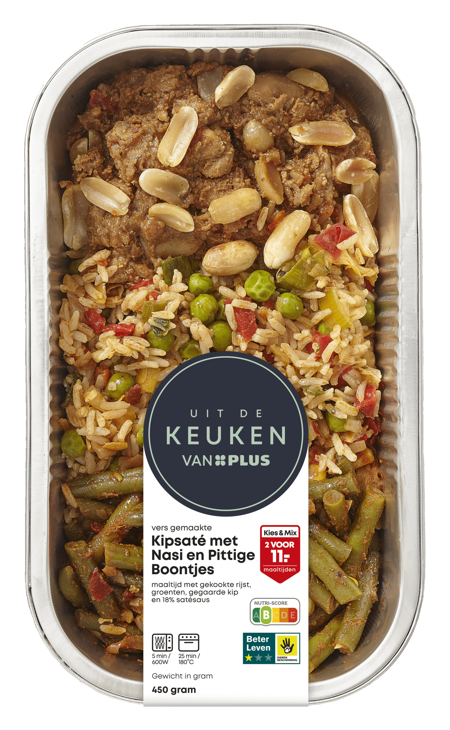 Geniet van een heerlijke encomplete maaltijd met de Kipsaté met pittige boontjes nasi van Uit de keuken van PLUS. Deze maaltijd bevat 15% gekookte rijst, sappige kip, verse groenten en een smakelijke satésaus. Met een Nutri-Score B en Beter Leven 1 Ster keurmerk is dit een verantwoorde keuze, perfect voor een snelle en voedzame lunch of diner.