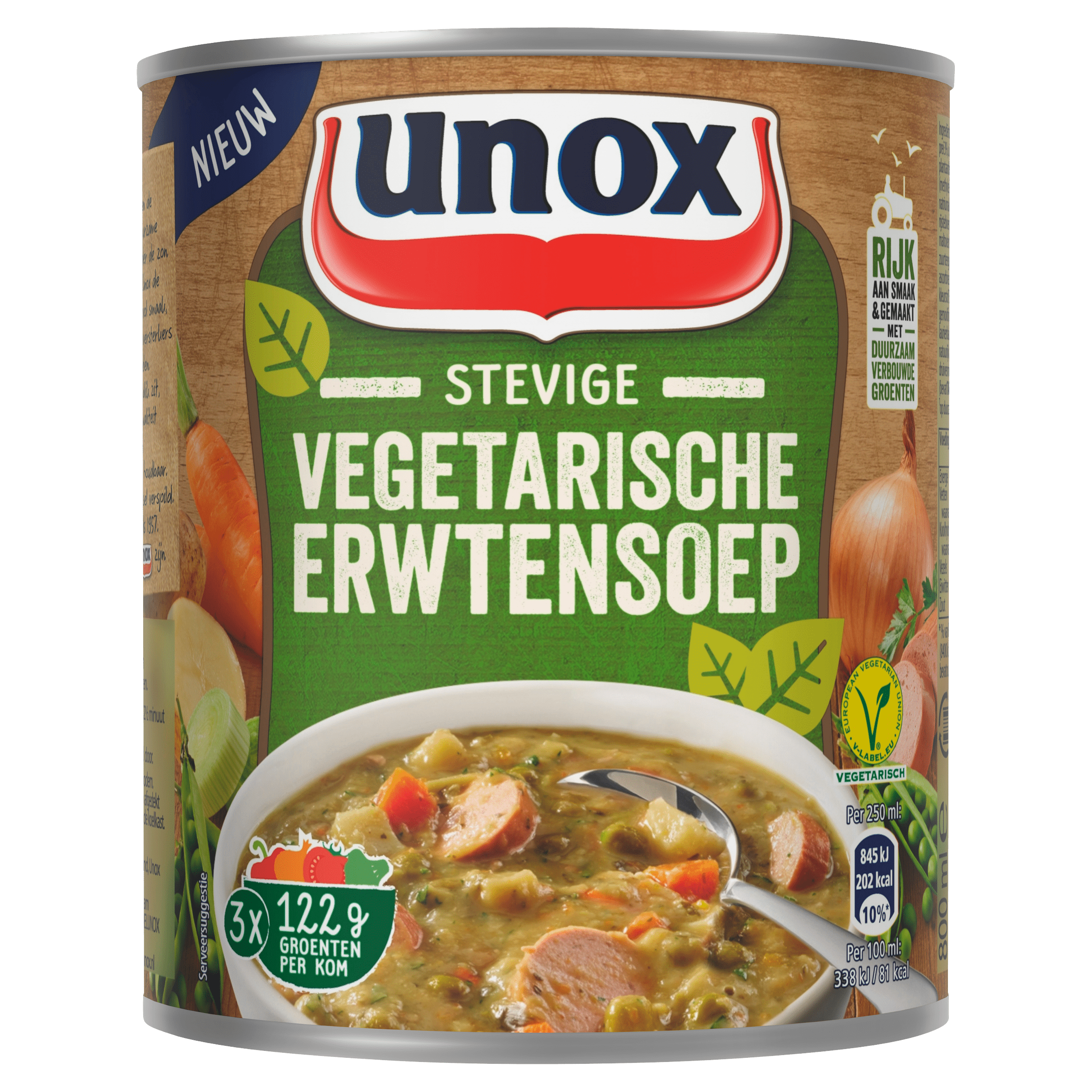 Geniet van de oer-Hollandse smaak met de Unox Vegetarische Erwtensoep, nu in een heerlijke versie met vegetarische rookworst en veel groenten. Deze soep is eenvoudig te bereiden in slechts 2,5 minuut in de magnetron of verwarmd in een pan. Met 47% duurzaam verbouwde groenten en zonder toegevoegde smaakversterkers en conserveermiddelen, is deze soep perfect voor een snel en verantwoord diner. Geschikt voor vegetariërs en goed voor meer dan 3 kommen soep. De ideale keuze voor een verwarmend voorgerecht of als maaltijd met vers brood.