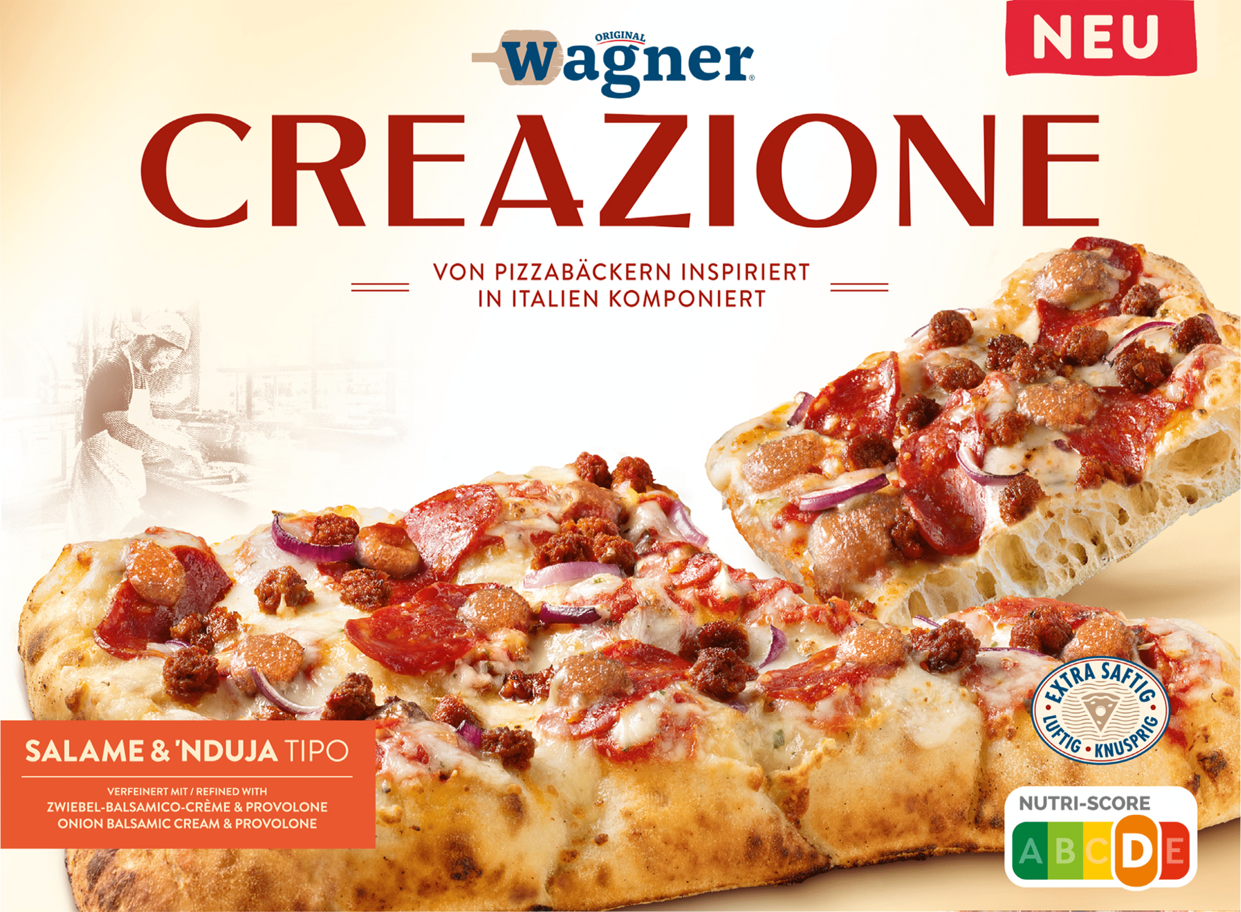 Geniet van de heerlijke Wagner Creazione Salami & Nduja pizza, een perfecte combinatie van gerookte peperoni-salami en kruidig varkensvlees in ‘Nduja-stijl, belegd met mozzarella en gepelde gehakte tomaten. Deze diepgevroren pizza is eenvoudig te bereiden in de oven en zorgt voor een smaakvolle maaltijd met een knapperige korst en smeltende kaas. Perfect voor een gezellige avond met vrienden of als snelle, lekkere maaltijd onderweg.