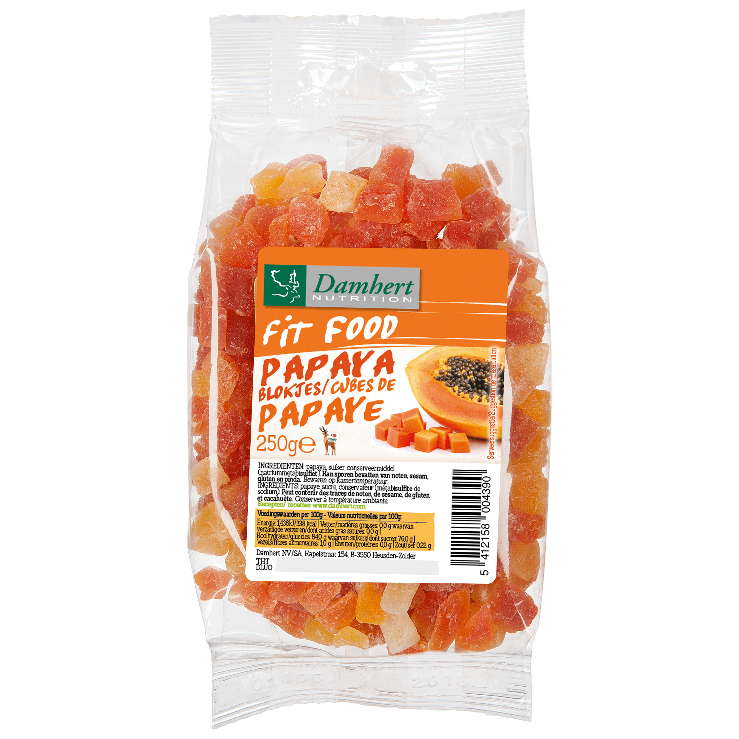 Geniet van de Damhert Fit Food Papaya Blokjes, een heerlijke en voedzame snack die je een energieboost geeft na fysieke inspanning. Deze papayablokjes zijn rijk aan antioxidanten en extra gezoet met suiker, ideaal als toevoeging bij (plantaardige) yoghurt, kaas of gebak. Perfect om je fit en energiek te houden!
