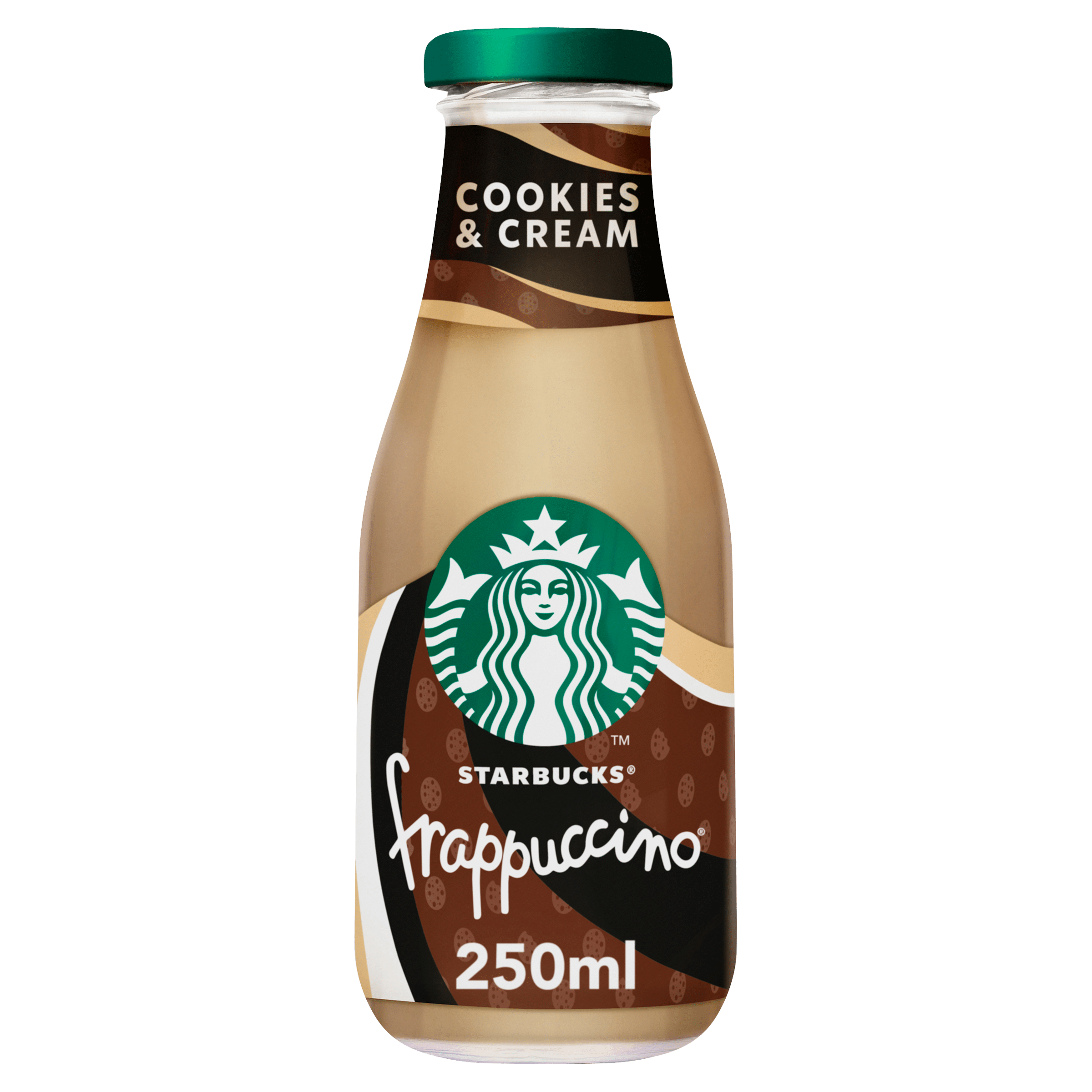 Geniet van de onweerstaanbare Starbucks Frappuccino® Cookies & Cream, een luxe ijskoffie gemaakt van 100% Arabica koffie, romige melk en een heerlijke koekjes- en roomsmaak. Perfect voor een verfrissende traktatie, of je nu thuis bent of onderweg. Gewoon gekoeld drinken of over ijs schenken voor een extra verwennerij.