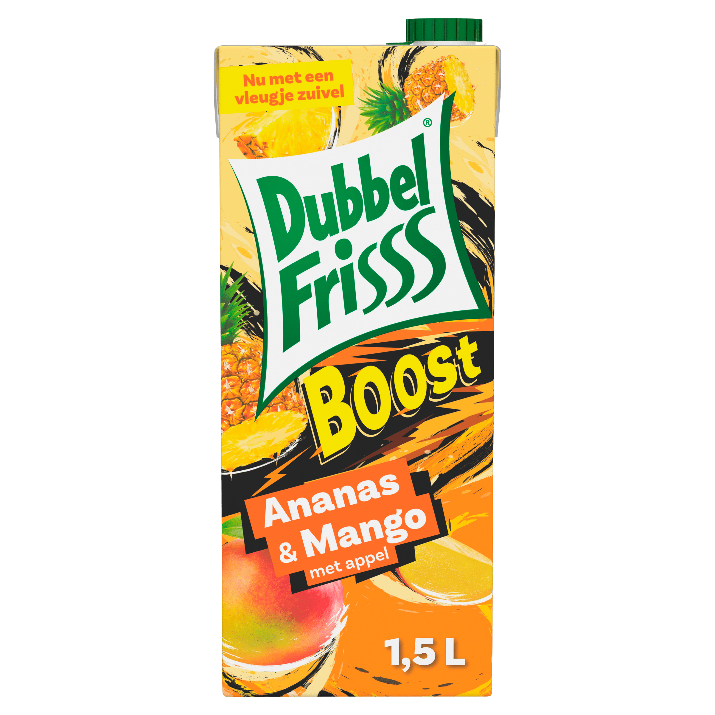 Dubbelfrisss Boost ananas & mango is een heerlijke verfrissende drank, boordevol smaak en met een uniek vleugje zuivel. Met vruchtensap uit concentraat van appel, ananas en mango, gecombineerd met puur bronwater uit de Veluwe, biedt deze drank een geweldige smaakervaring. Het product bevat ook toegevoegde vitamines voor extra ondersteuning. Daarnaast is het verpakt in een duurzame verpakking die meer dan 95% uit plant-based materialen bestaat en volledig recyclebaar is.