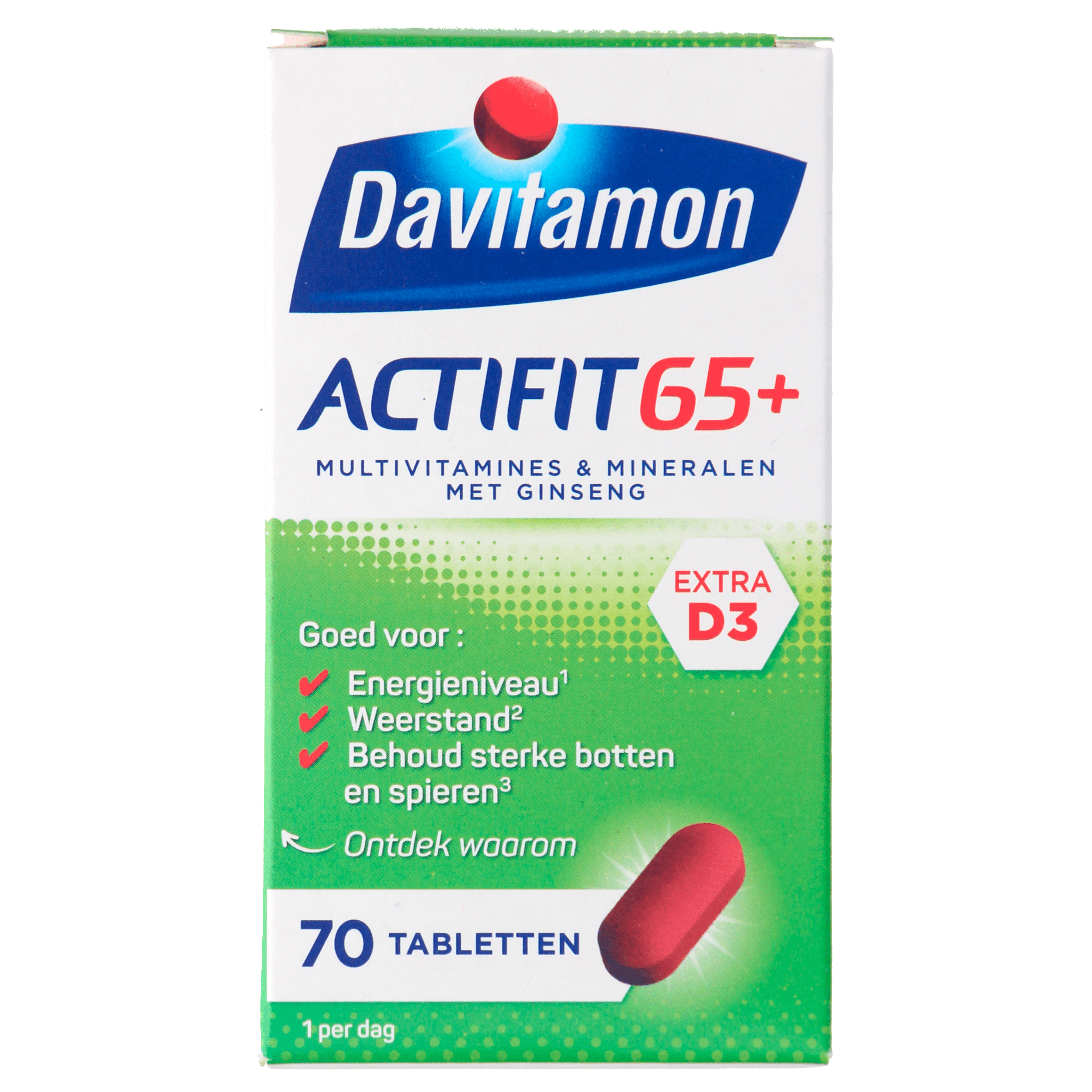 Davitamon Vitamine Actifit 65+ is een speciaal samengesteld supplement voor de actieve oudere generatie. Met zorgvuldig geselecteerde vitamines en mineralen ondersteunt het je gezondheid en vitaliteit. Dit product bevat een rijke mix van belangrijke voedingsstoffen, zoals vitamine A, B-vitamines, vitamine C, D en E, en mineralen zoals calcium en magnesium. Perfect voor een dagelijkse boost voor een gezonder leven!