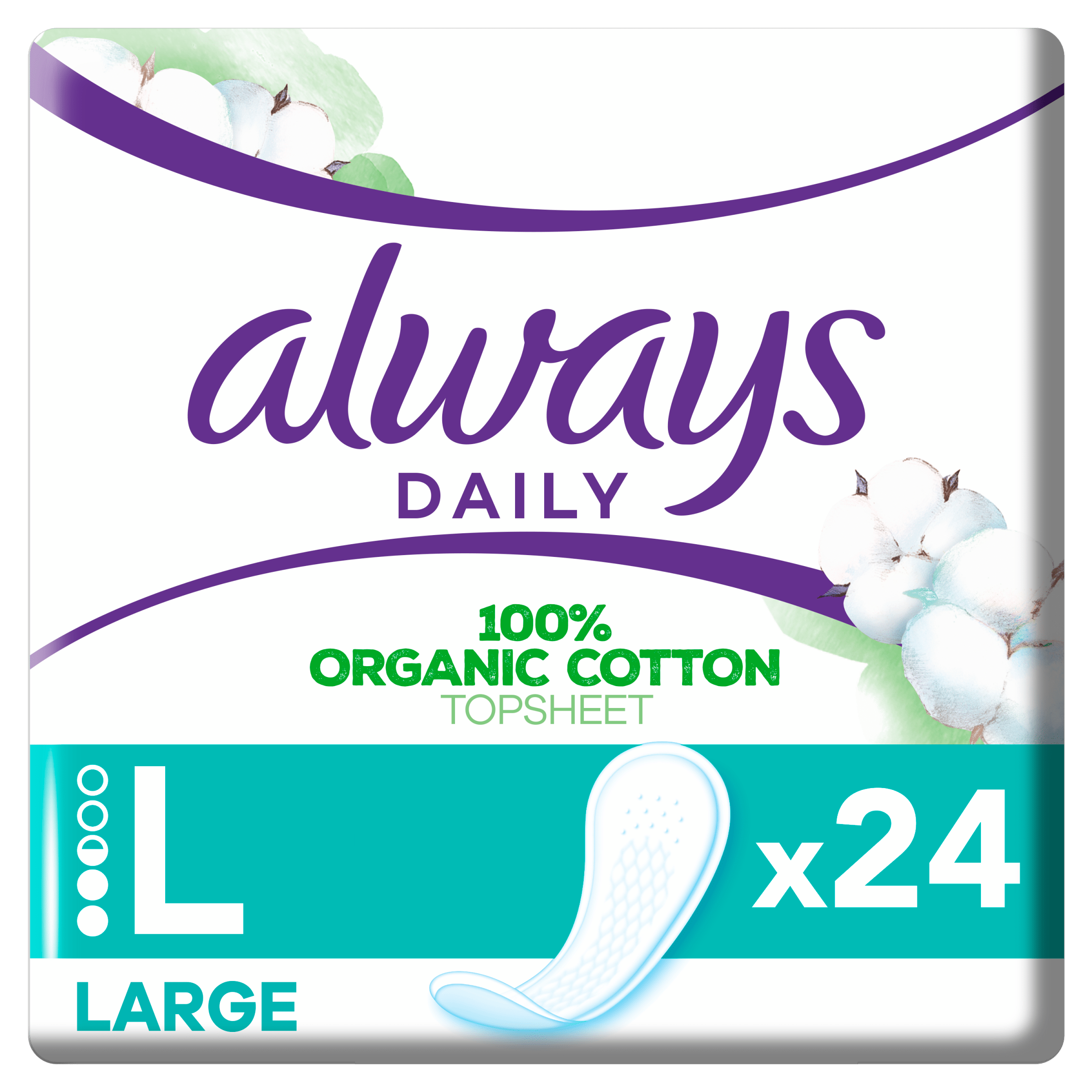 De Always Cotton Protect inlegkruisjes large bieden optimale dagelijkse bescherming en zijn voorzien van een toplaag van 100% biologisch katoen. Deze inlegkruisjes zijn parfum- en kleurstofvrij, waardoor ze ideaal zijn voor dagelijks gebruik. Met een comfortabel, ademend design en een effectieve absorberende kern zijn deze inlegkruisjes goedgekeurd door dermatologen en gecertificeerd door Cotton Inc. Een betrouwbare keuze voor je persoonlijke verzorging.