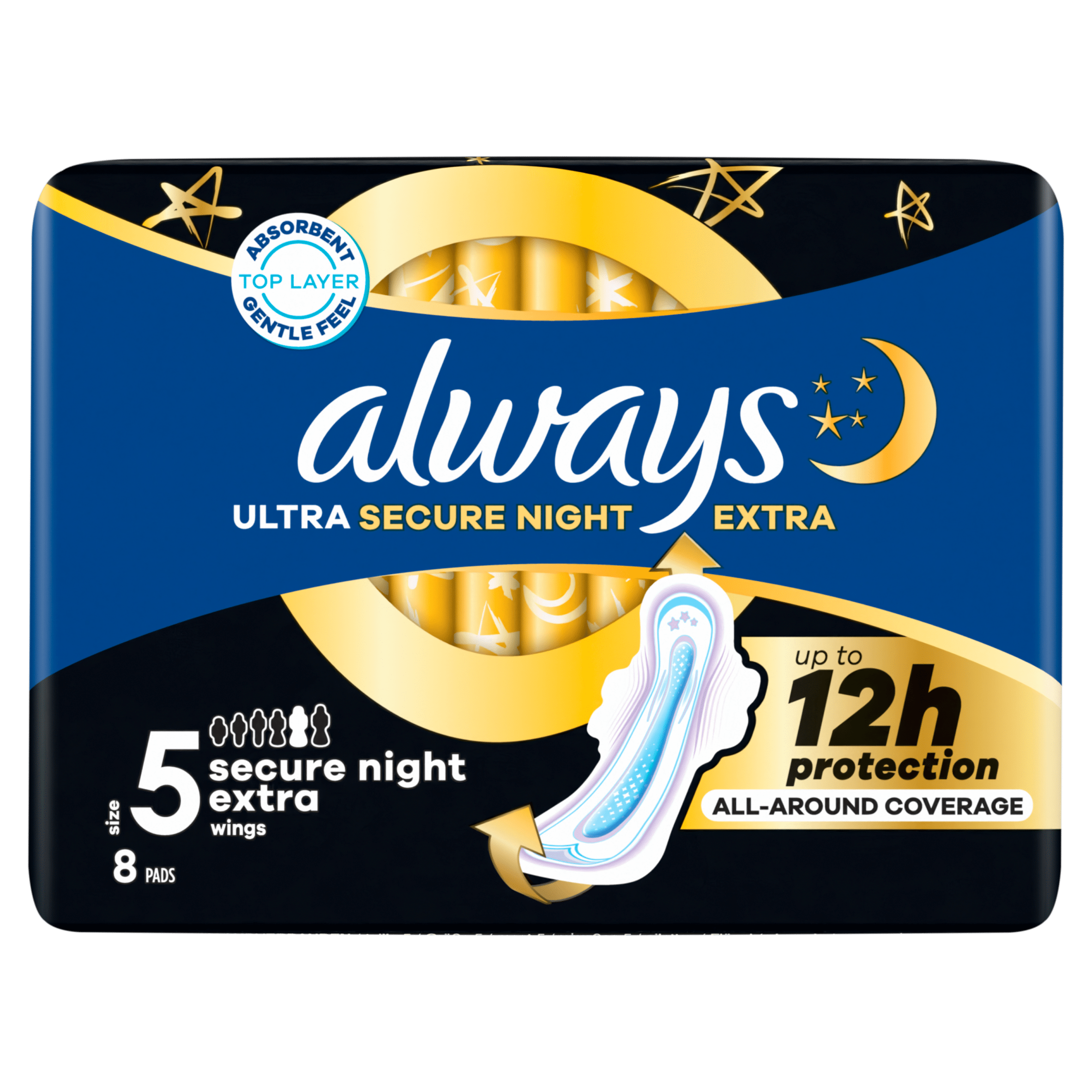 Geniet van een ongestoorde nachtrust met Always Ultra Secure Night Extra maandverband. Deze maandverbanden zijn speciaal ontworpen voor tot 12 uur bescherming, met een 9% grotere voorkant en 85% grotere achterkant dan de normale maat. De innovatieve LeakGuard technologie houdt vocht binnen en voorkomt lekken, terwijl de zachte absorberende toplaag en OdourBlock technologie ongewenste geuren neutraliseren. Met het superabsorberende InstantDry systeem absorberen ze vocht in enkele seconden. Gemaakt van 50% gerecycled plastic in de buitenverpakking en dermatologisch goedgekeurd.