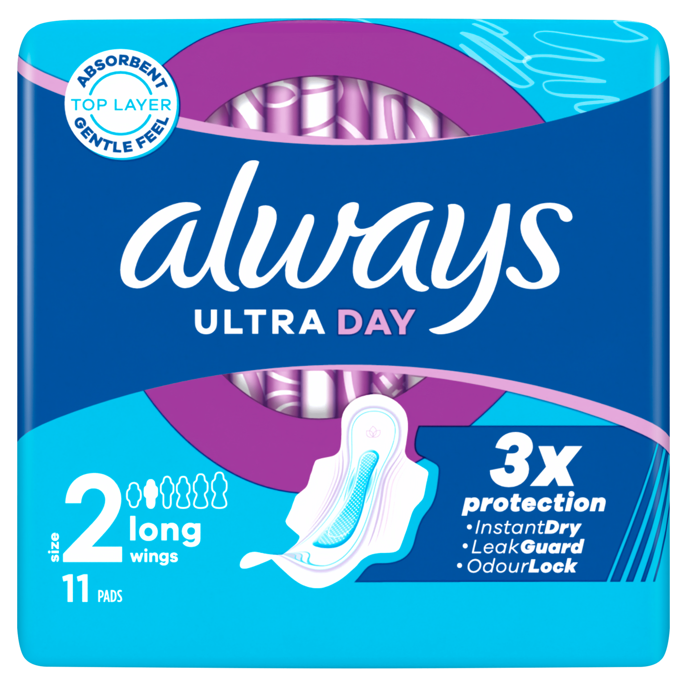 Ervaar de drievoudige bescherming van Always Ultra Day Long maandverband. Met het innovatieve InstantDry systeem absorbeert het vocht in enkele seconden, terwijl de LeakGuard technologie lekken voorkomt. Dankzij de zachte toplaag en OdourBlock technologie blijf je fris gedurende de dag. De ComfortLock vleugels passen perfect in elk type ondergoed. Dit maandverband is goedgekeurd door dermatologen van de Skin Health Alliance en is verpakt in 50% gerecycled plastic.