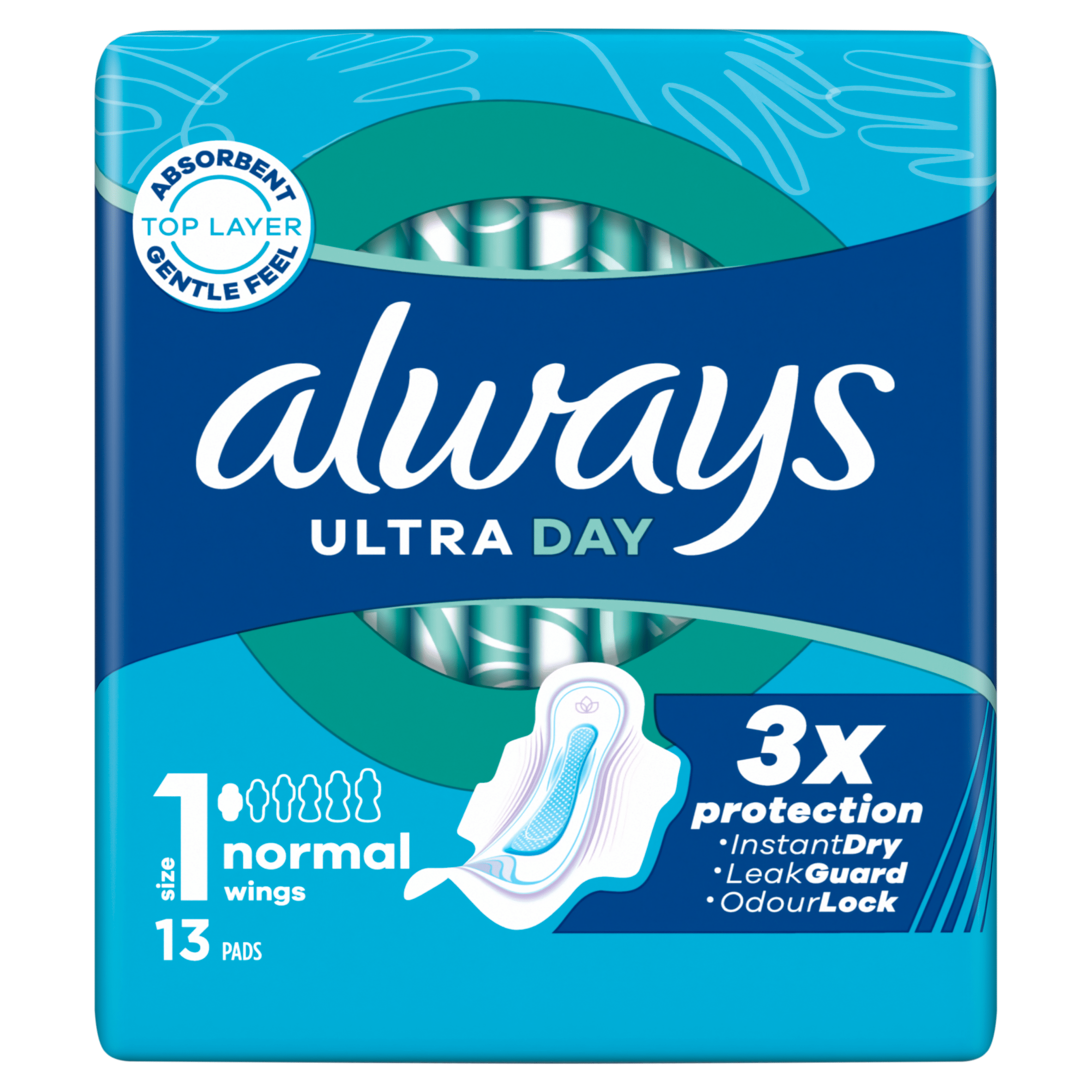 Ervaar de drievoudige bescherming van Always Ultra Day Normal maandverband met vleugels. Deze superabsorberende maandverbanden zijn uitgerust met het innovatieve InstantDry systeem, dat vocht in een paar seconden absorbeert. Met de LeakGuard-technologie blijft je droog en veilig, terwijl de OdourBlock technologie nare geurtjes neutraliseert. De zachte, absorberende toplaag en de ComfortLock vleugels zorgen ervoor dat het maandverband perfect aansluit bij elk type ondergoed. Bovendien is de verpackking gemaakt van 50% gerecycled plastic en is goedgekeurd door dermatologen van de Skin Health Alliance.