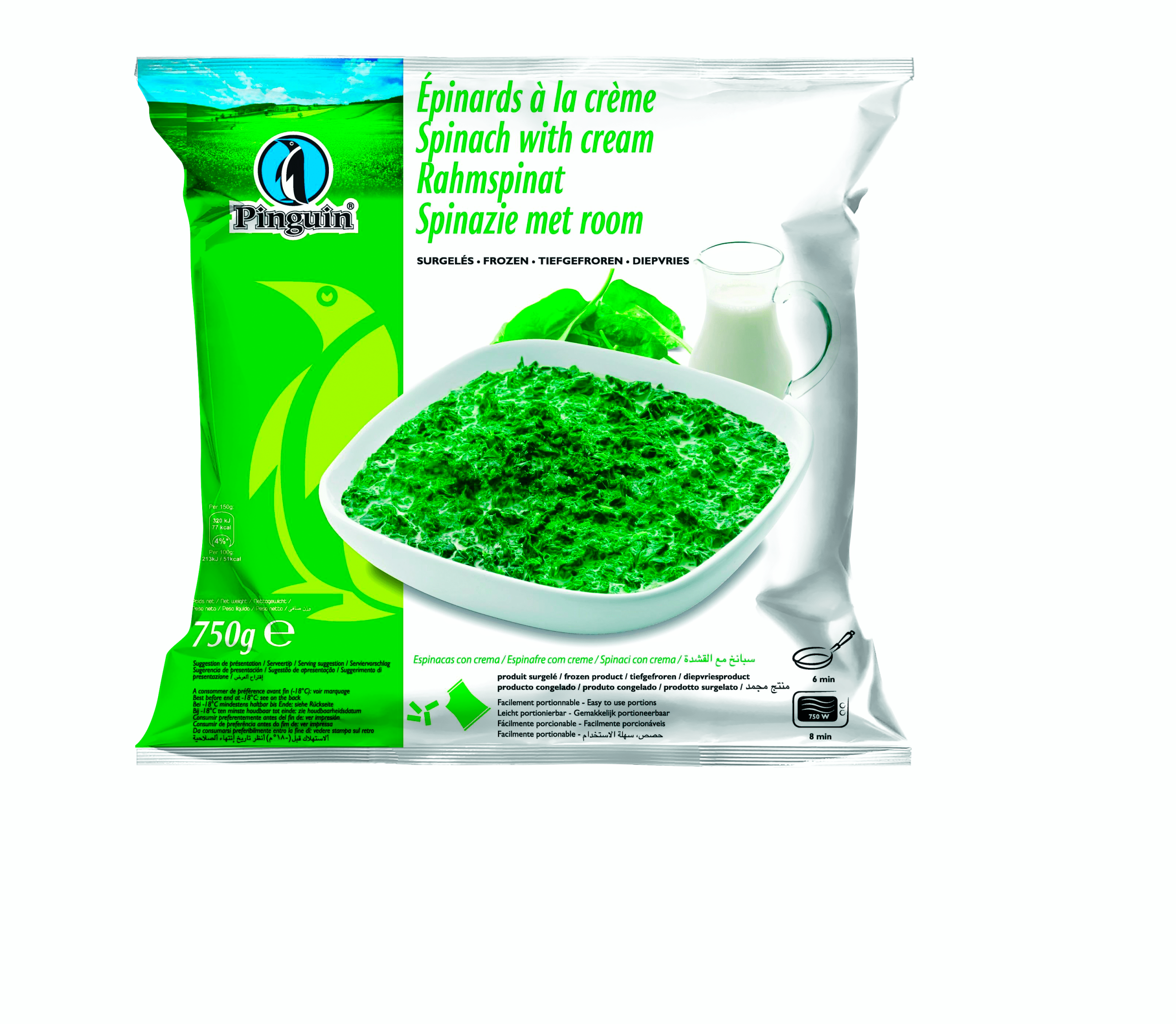 Geniet van de romige smaak van Pinguin Spinazie met Room, een diepvriesproduct dat 70% spinazie bevat. Perfect als bijgerecht of toevoeging aan je favoriete gerechten. Makkelijk te bereiden in een steelpan met water, waarbij de spinazie zijn smaak en voedingsstoffen behoudt. Eenmaal ontdooid niet opnieuw invriezen voor de beste kwaliteit.