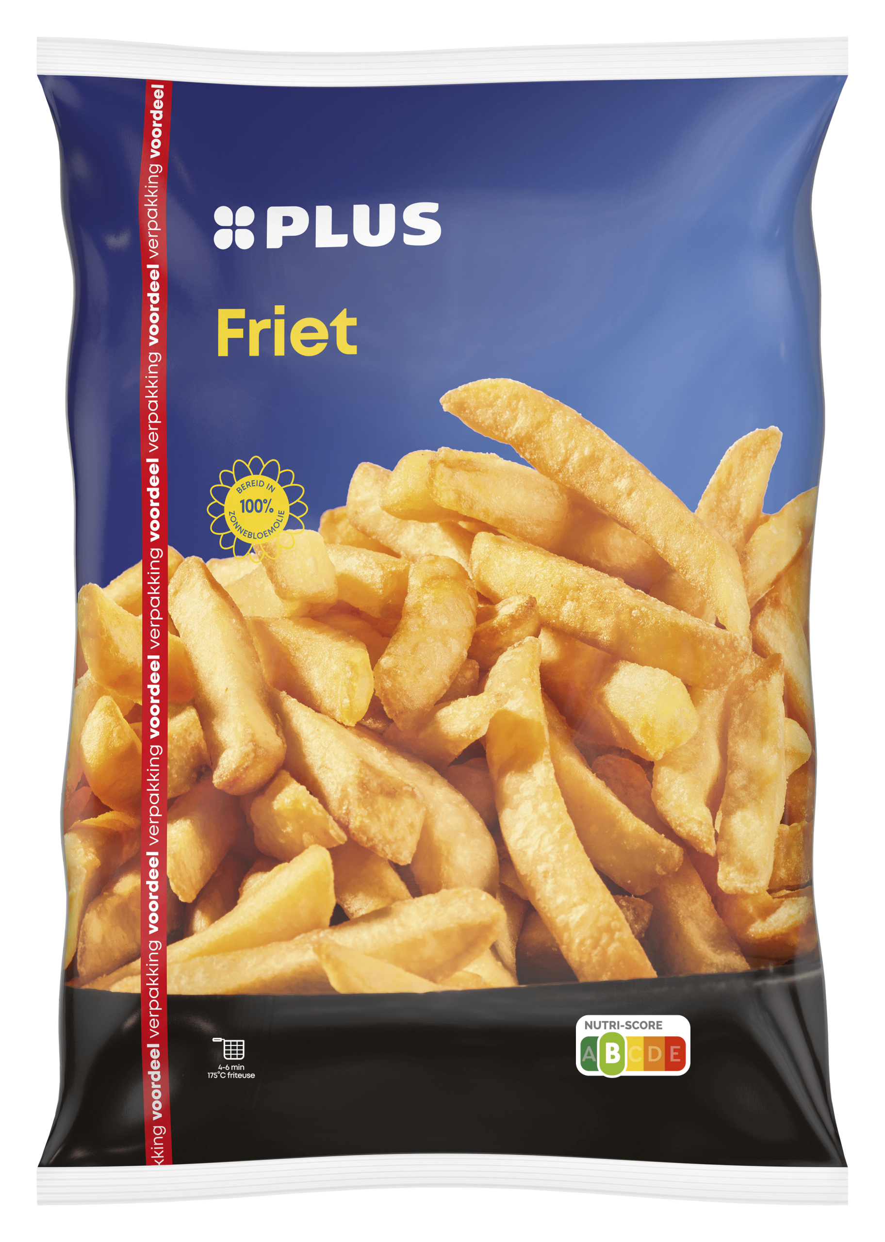 Geniet van de heerlijke PLUS Patat frites, gemaakt van 97% aardappelen en 3% zonnebloemolie. Deze voorgebakken frites zijn diepgevroren en geclassificeerd met Nutri-Score B. Perfect voor een snelle en makkelijke maaltijd en geschikt voor zowel veganisten als vegetariërs. Bereid ze in de friteuse voor een perfecte krokante bite in slechts 4 tot 6 minuten.