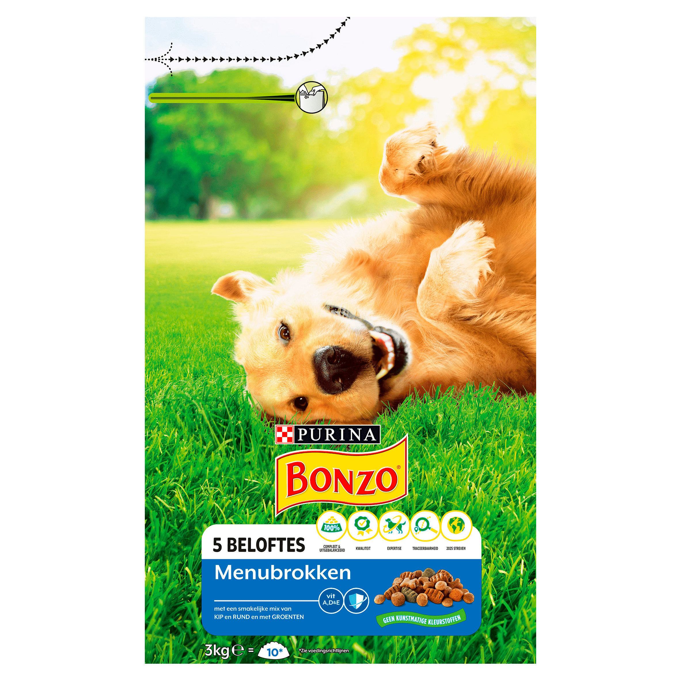 PURINA® Bonzo® Adult menubrokken hondenvoer met kip is een hoogwaardige voeding vol essentiële voedingsstoffen en eiwitten die jouw hond helpen om gezond en gelukkig te blijven. Dit volledige diervoeder ondersteunt de natuurlijke afweer van je viervoeter en bevordert een glanzende vacht, gezonde huid en stevige ontlasting. Zorg ervoor dat je hond altijd vers drinkwater heeft en pas de dagelijkse porties aan op basis van zijn gewicht voor een ideaal lichaamsgewicht.