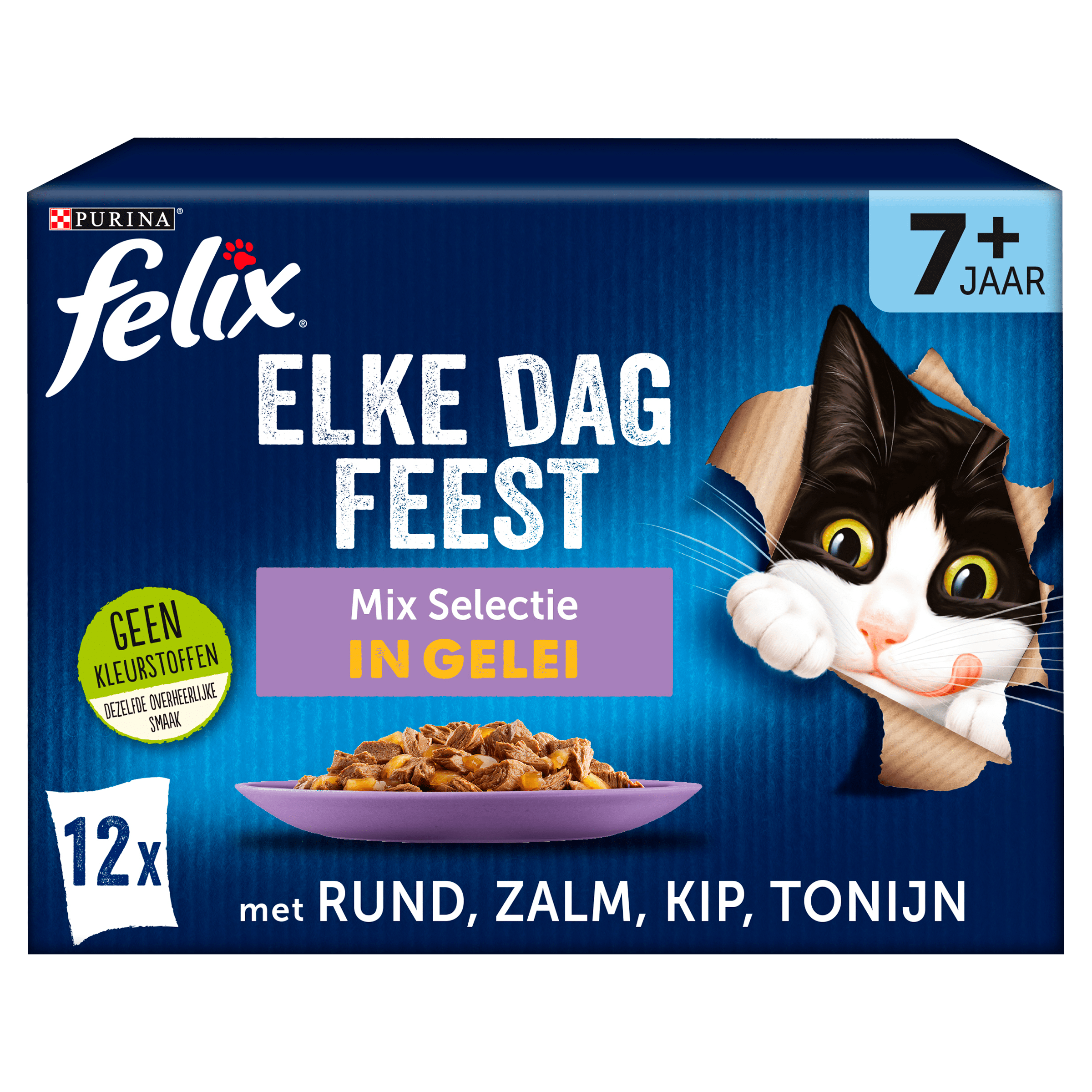 FELIX Elke Dag Feest 7+ biedt een assortiment onweerstaanbare maaltijden voor katten ouder dan 7 jaar. Bereid met malse reepjes in heerlijke gelei, zorgen deze maaltijden voor een smakelijke eetervaring die zelfs de meest kieskeurige katten zal verleiden. Iedere maaltijd is ontworpen met de juiste combinatie van eiwitten en vitamines, inclusief antioxidanten, zodat jouw kat vol energie door het leven kan. Dit volledig diervoeder voldoet aan de dagelijkse voedingsbehoeften van jouw senior kat en is vrij van kunstmatige smaakstoffen en conserveringsmiddelen.