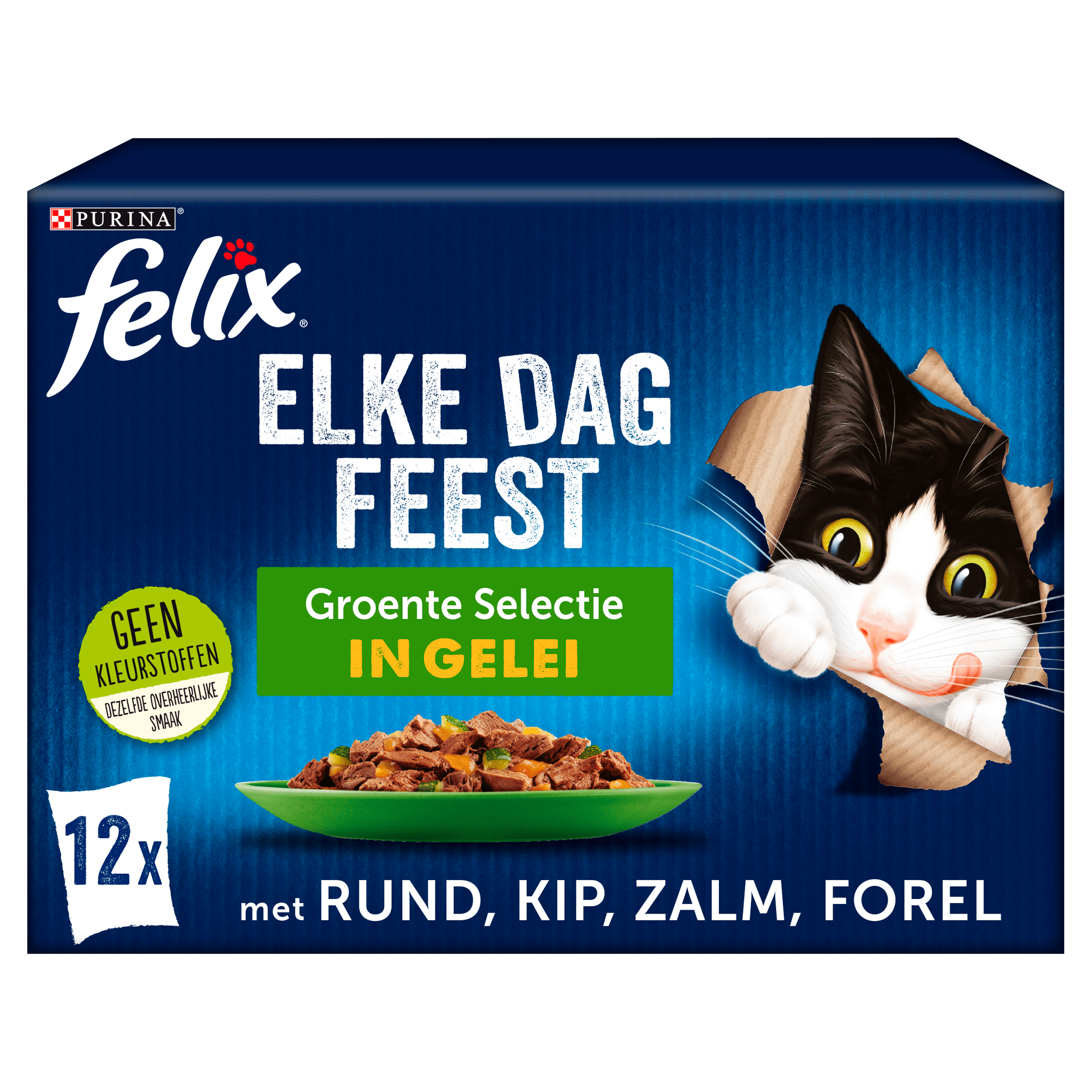 Geef jouw kat het feest dat hij verdient met Felix Elke Dag Feest met groenten! Dit assortiment onweerstaanbare maaltijden, bereid met zachte stukjes in overheerlijke gelei, zorgt ervoor dat jouw kat elke dag geniet van zijn eten. Met een perfecte balans van 100% volledig en gebalanceerd diervoeder, is deze voeding rijk aan Vitamine D en E en bevat het ook omega 6-vetzuren. Felix biedt een variëteit aan recepten die niet alleen heerlijk smaken, maar ook voldoen aan de voedingsbehoeften van jouw kat. Ideaal voor de actieve kat die houdt van avontuur!