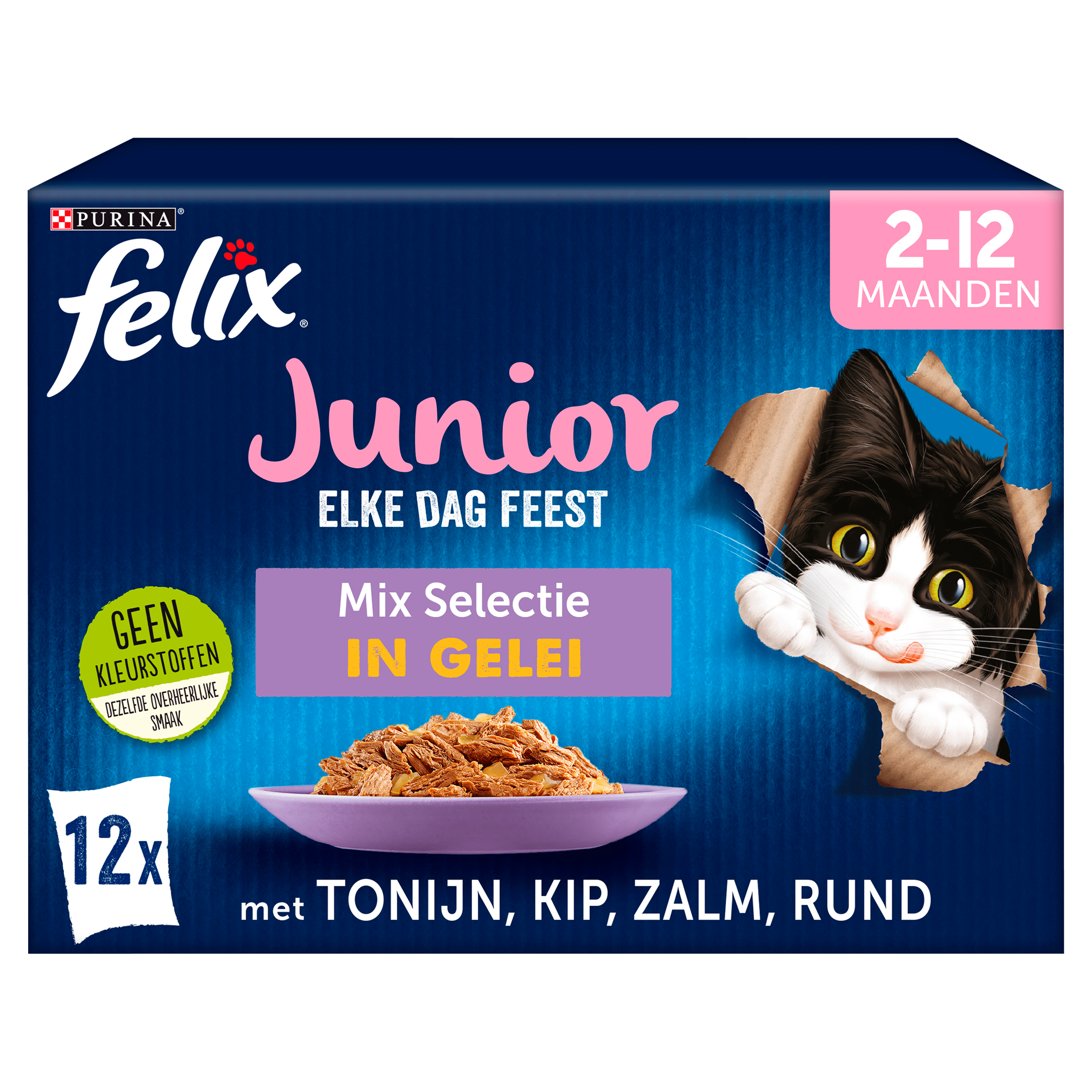 Felix Elke Dag Feest Junior is een onweerstaanbaar assortiment maaltijden voor kittens, zorgvuldig bereid met malse reepjes in rijke gelei. Dit volledige en gebalanceerde natvoer bevat geen kunstmatige smaakstoffen of conserveringsmiddelen, en boordevol eiwitten en vitamines ter ondersteuning van de groei van sterke spieren, botten en tanden. Dankzij de verschillende recepten zal jouw kitten elke maaltijd met plezier verorberen. Ideaal voor kittens tot 12 maanden, ook geschikt voor gesteriliseerde en zogende katten.