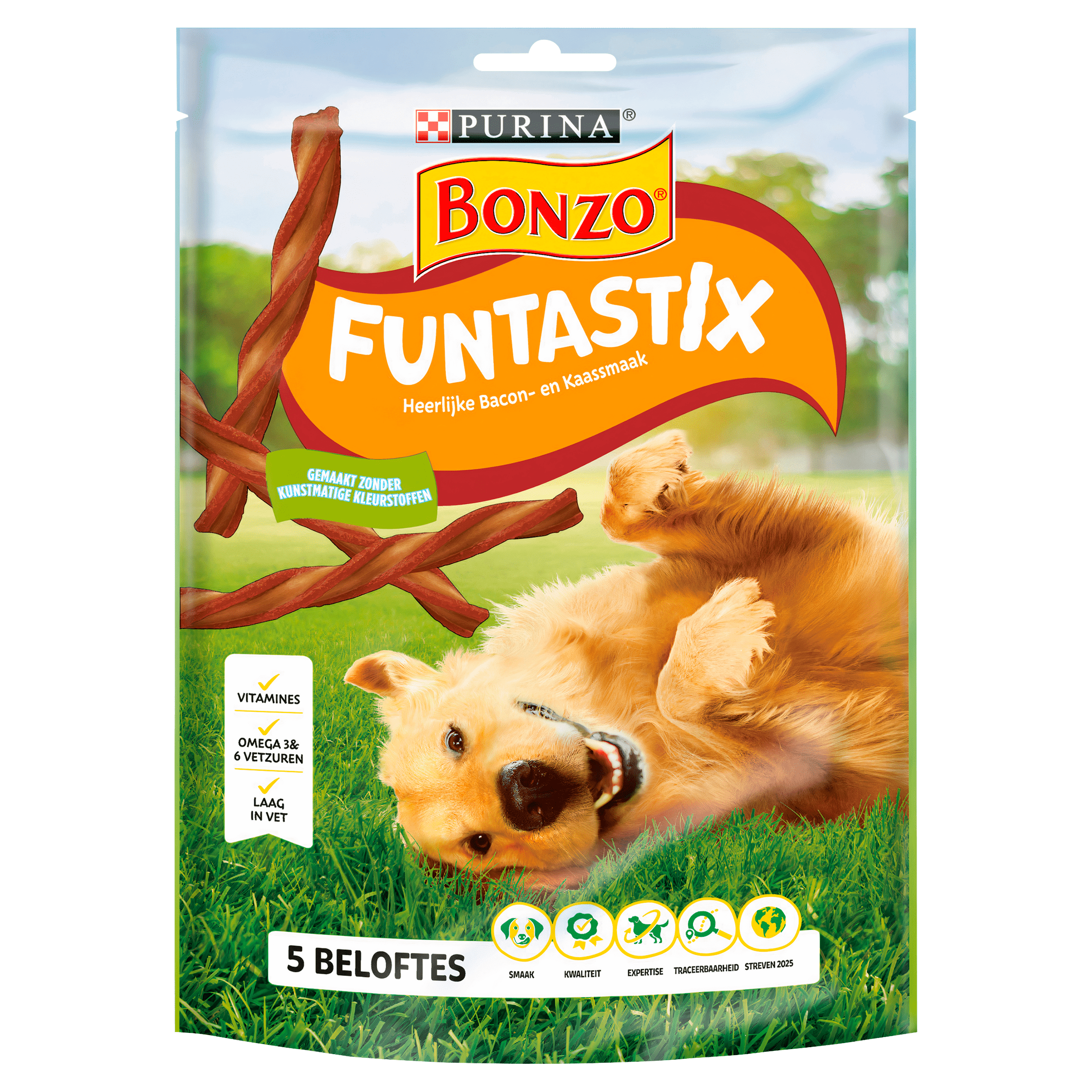 Verwen je hond met de heerlijke Bonzo Funtastix hondensnacks in bacon- en kaassmaak. Deze snacks zijn laag in vet en gemaakt zonder kunstmatige kleurstoffen, smaakstoffen of conserveermiddelen. Rijk aan essentiële omega 3- en 6-vetzuren en vitamines, zijn ze perfect als beloning of tussendoortje op elk moment van de dag. Geef ze in z’n geheel of breek ze in hapklare stukjes voor je trouwe viervoeter!