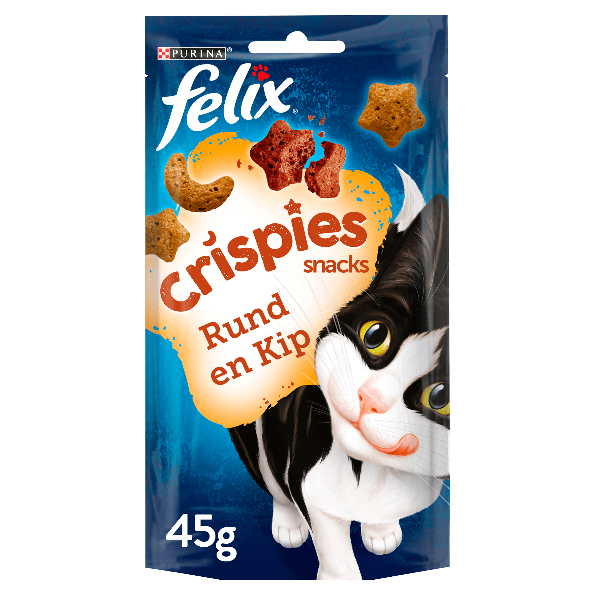 Felix Crispies kattensnacks zijn onweerstaanbare, luchtige snoepjes voor je kat, met een unieke knapperige textuur. Deze lekkere snacks zijn beschikbaar in een verrukkelijke combinatie van smaken, waaronder rund en kip. Ze bevatten geen kunstmatige kleurstoffen en zijn verrijkt met eiwitten, vitamines en Omega 6-vetzuren die bijdragen aan de gezondheid en het welzijn van je kat. Verwen je viervoeter elke dag met deze gezonde en smakelijke traktatie!
