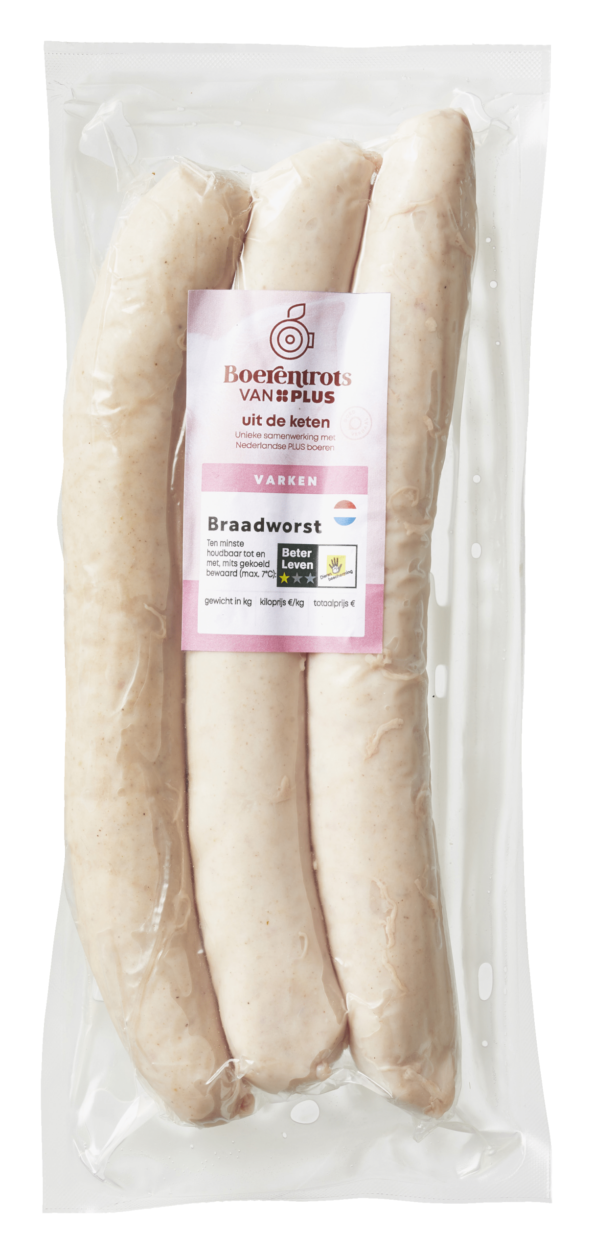 Geniet van de heerlijke smaak van de PLUS Braadworst, gemaakt van 77% varkensvlees met het Beter Leven 1 Ster keurmerk. Deze gekruide worstjes zijn perfect voor op de BBQ of in de koekenpan en zijn eenvoudig te bereiden. Bewaar ze gekoeld voor de beste smaak!