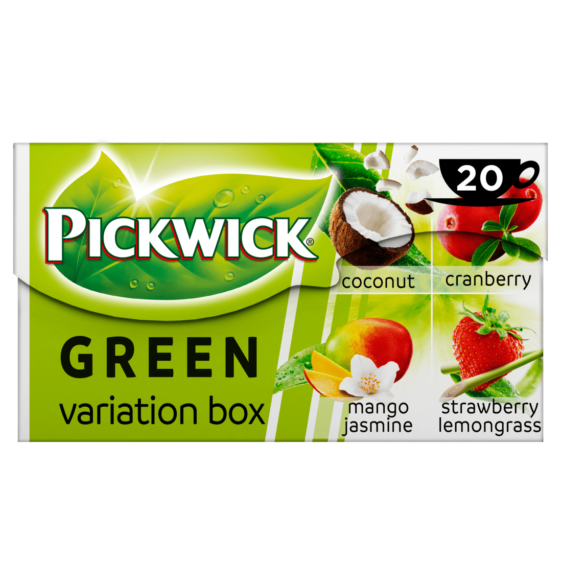 Geniet van de smaken van de natuur met het Pickwick Variatie groene thee doosje. Dit assortiment bevat vier heerlijke smaken: kokosnoot, cranberry, mango-jasmijn en aardbei-citroengras. Elke thee is afkomstig van een Rainforest Alliance gecertificeerde theeplantage, wat zorgt voor een verantwoorde keuze. Perfect voor een moment van rust of om te delen met vrienden. Laat de zakjes 2-3 minuten trekken voor een optimale smaak.