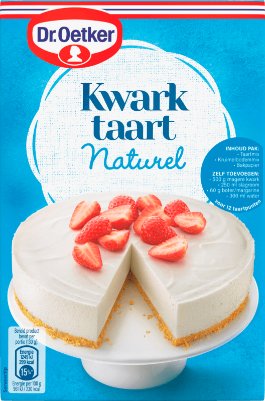 Maak zelf een heerlijke, frisse kwarktaart met de Dr. Oetker Kwarktaart naturel bakmix. Deze luchtige taart is eenvoudig te bereiden en staat binnen 15 minuten op tafel. Laat de taart 2,5 uur opstijven in de koelkast en voeg jouw favoriete fruit toe voor een extra verrassing. Perfect voor een traktatie of als dessert!