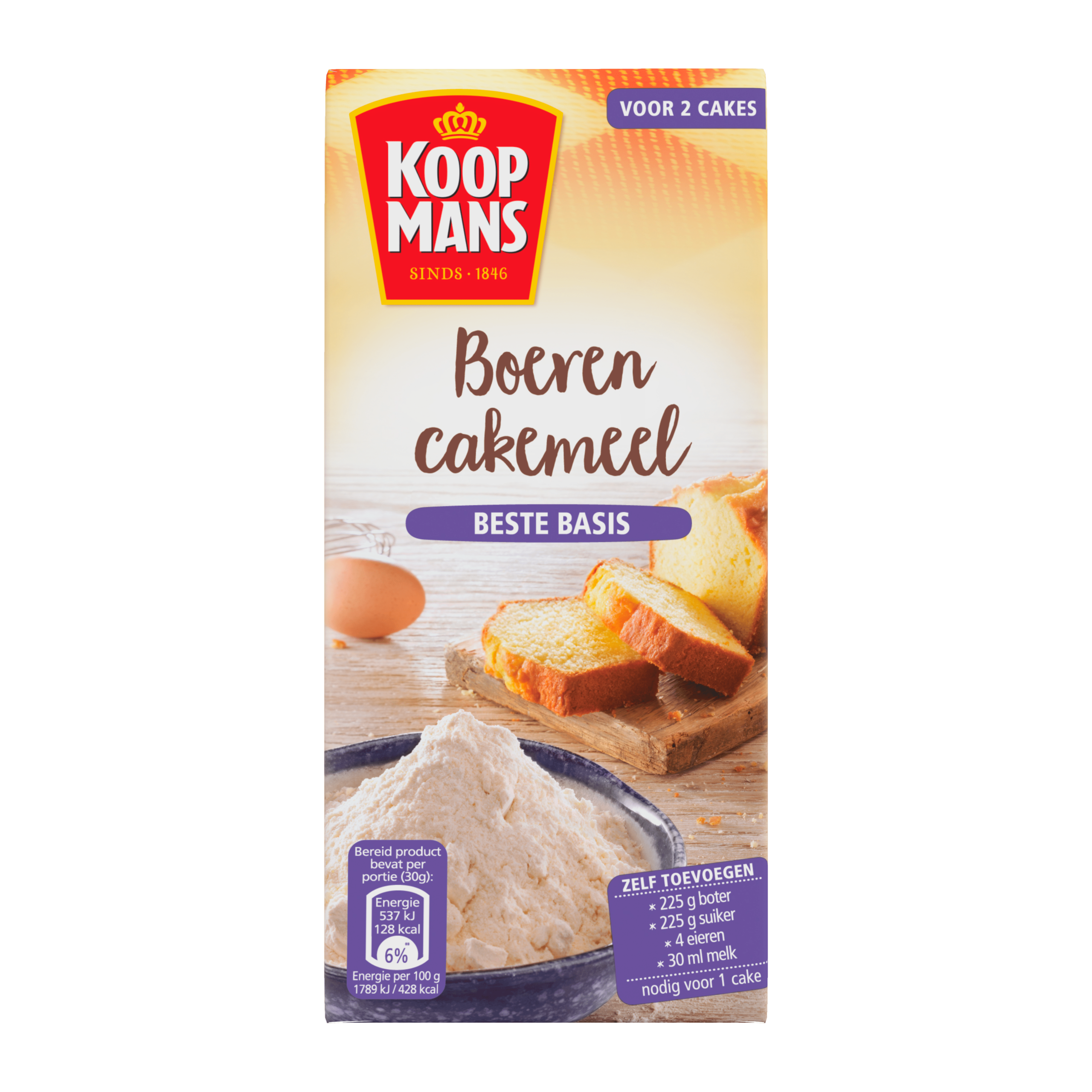 Bak met gemak twee heerlijke cakes met Koopmans Boerencakemeel! Deze bakmix is de perfecte basis voor een volle, romige cake, ideaal voor het toevoegen van allerlei ingrediënten zoals noten of chocoladestukjes. Perfect voor het bakken met kinderen of als traktatie bij de koffie. Laat je creativiteit de vrije loop en maak een unieke cake die je kunt versieren met slagroom of hagelslag.