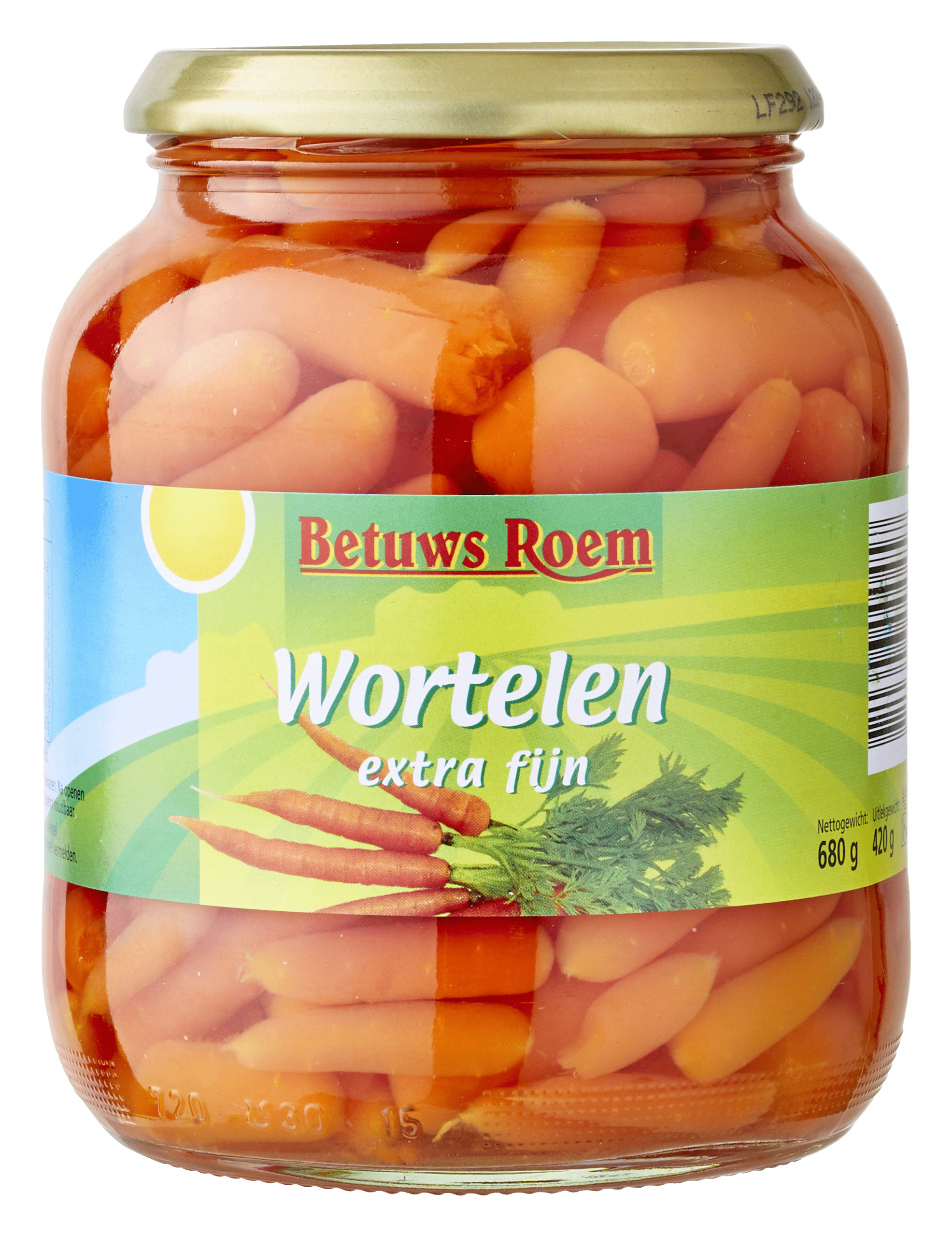 Betuws Roem Wortelen zijn extra fijne, smaakvolle wortelen die zorgvuldig zijn bereid en verpakt voor jouw gemak. Deze pot bevat 680 gram heerlijk knapperige wortelen, ideaal voor in salades, als bijgerecht of in verschillende warme gerechten. Ze zijn eenvoudig te bewaren en na openen ook gekoeld te gebruiken. Een gezonde keuze voor iedere maaltijd!