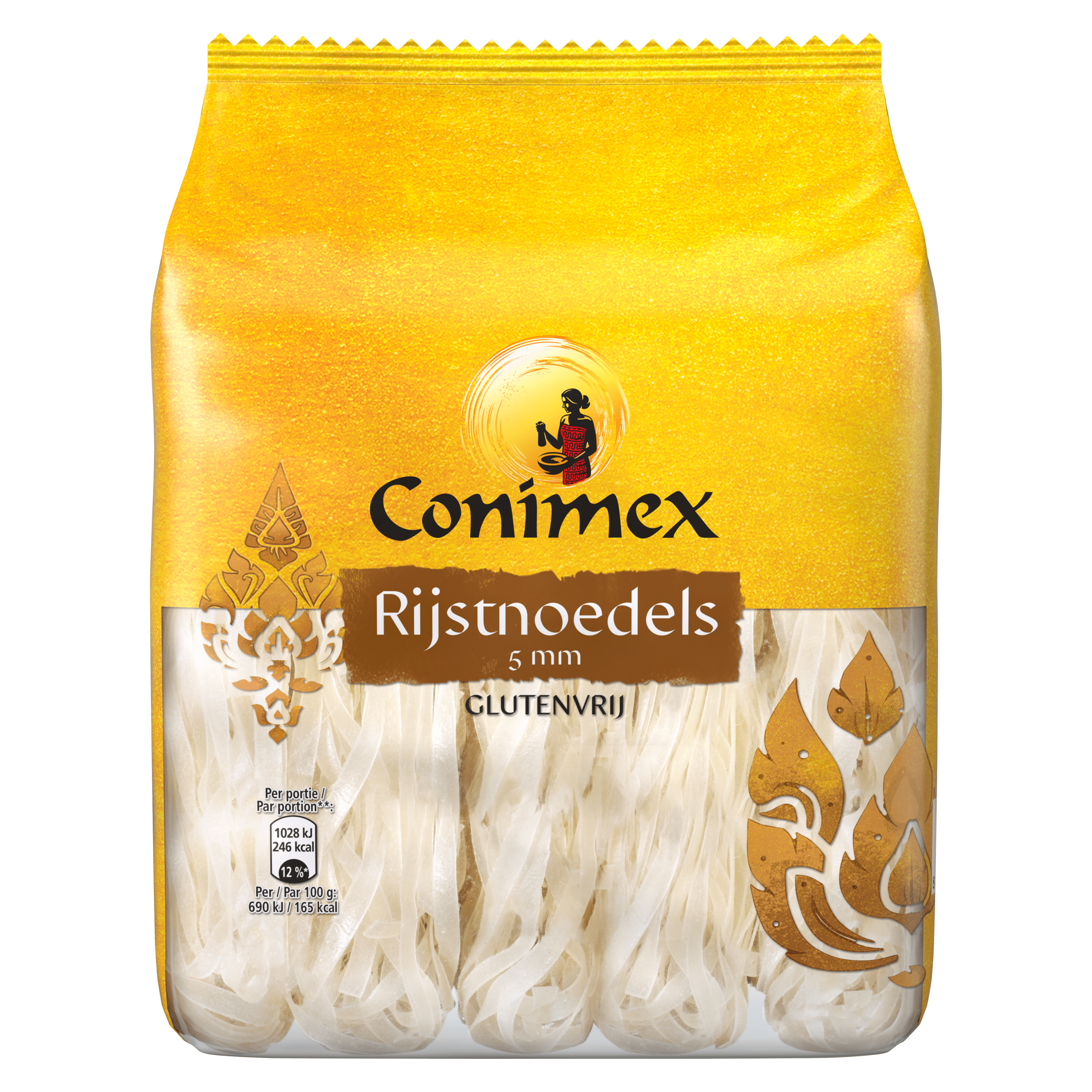 Conimex 5 mm Rijstnoedels zijn authentieke rijstnoedels uit Thailand, perfect voor in wokgerechten en oosterse soepen. Deze vegetarische en glutenvrije noedels zijn eenvoudig te bereiden in slechts 3 minuten. Maak thuis heerlijke Aziatische gerechten zoals het Thaise nationale noedelgerecht Pad Thai. Combineer ze met een van de smakelijke woksauzen van Conimex voor een compleet maaltijd, snel en makkelijk.