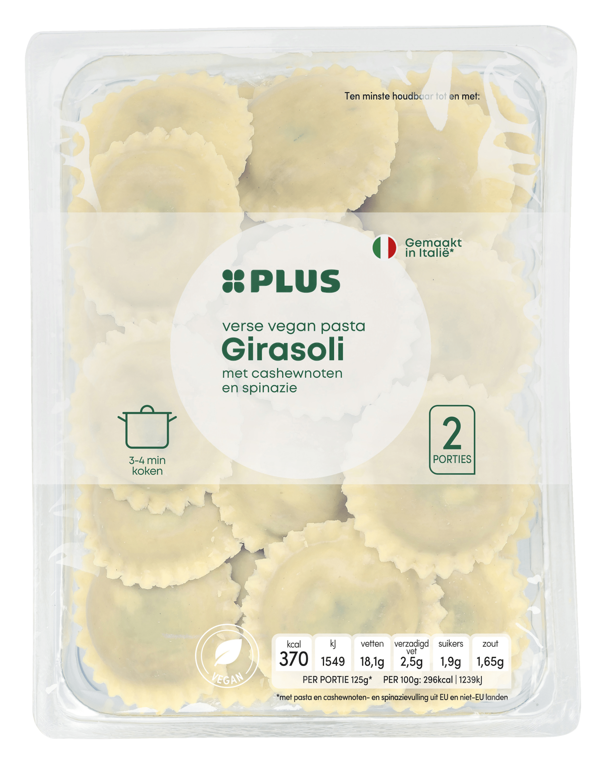 Geniet van de verrukkelijke PLUS Verse vegan pasta Girasoli, gevuld met een unieke combinatie van romige cashewnoot en frisse spinazie. Omhuld inDelicate pastadeeg, biedt deze pasta een authentieke Italiaanse ervaring in elke hap. Perfect voor een snel en smakelijk vegan gerecht.