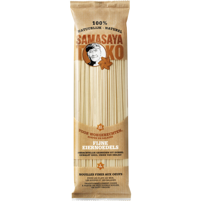 Geniet van de authentieke smaak van Samasaya Fijne Eiernoedels, gemaakt van hoogwaardig tarwebloem en vrije-uitloop eieren. Deze noedels worden vervaardigd volgens de traditionele walsmethode, waardoor ze perfect de smaken van kruiden en ingrediënten opnemen. Perfect voor het bereiden van wokgerechten, soepen en verfrissende salades. Een natuurlijk product, vrij van toevoegingen en gemaakt om bijzondere gerechten mee te creëren.