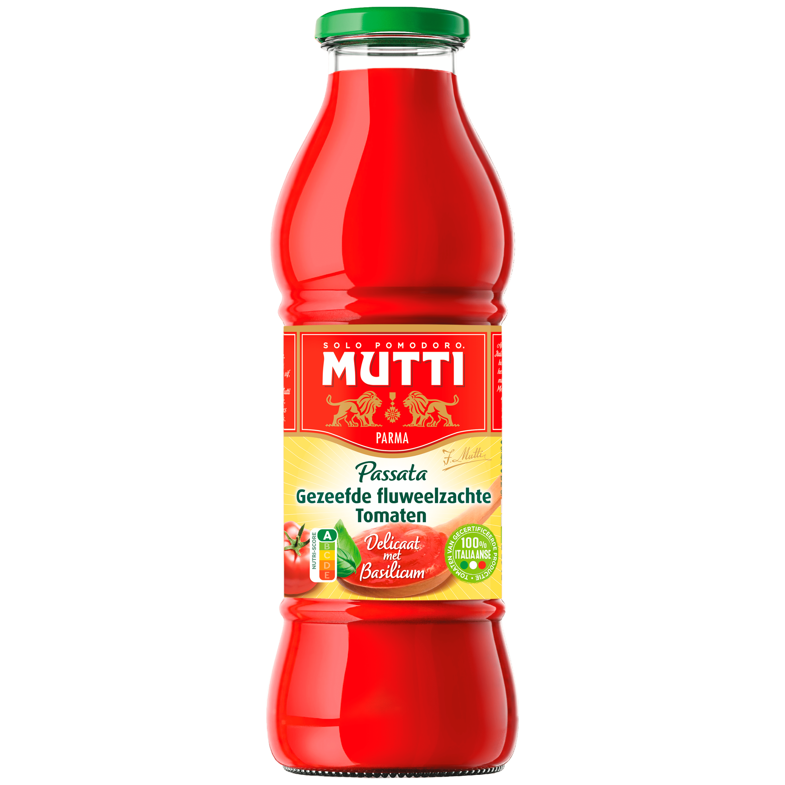 Geniet van de rijke smaak van Mutti Passata basilicum, een fluweelzachte tomatensaus gemaakt van 99% rijpe Italiaanse tomaten en een vleugje verse basilicum. Deze hoogwaardige saus, zonder schillen en zaadjes, is ideaal voor het bereiden van authentieke Italiaanse gerechten. Met een Nutri-Score A is het niet alleen lekker, maar ook een bewuste keuze. Perfect om je pasta, pizza of andere maaltijden eenextra smaakboost te geven. Na openen, in de koelkast bewaren en binnen 5 dagen gebruiken voor de beste kwaliteit.