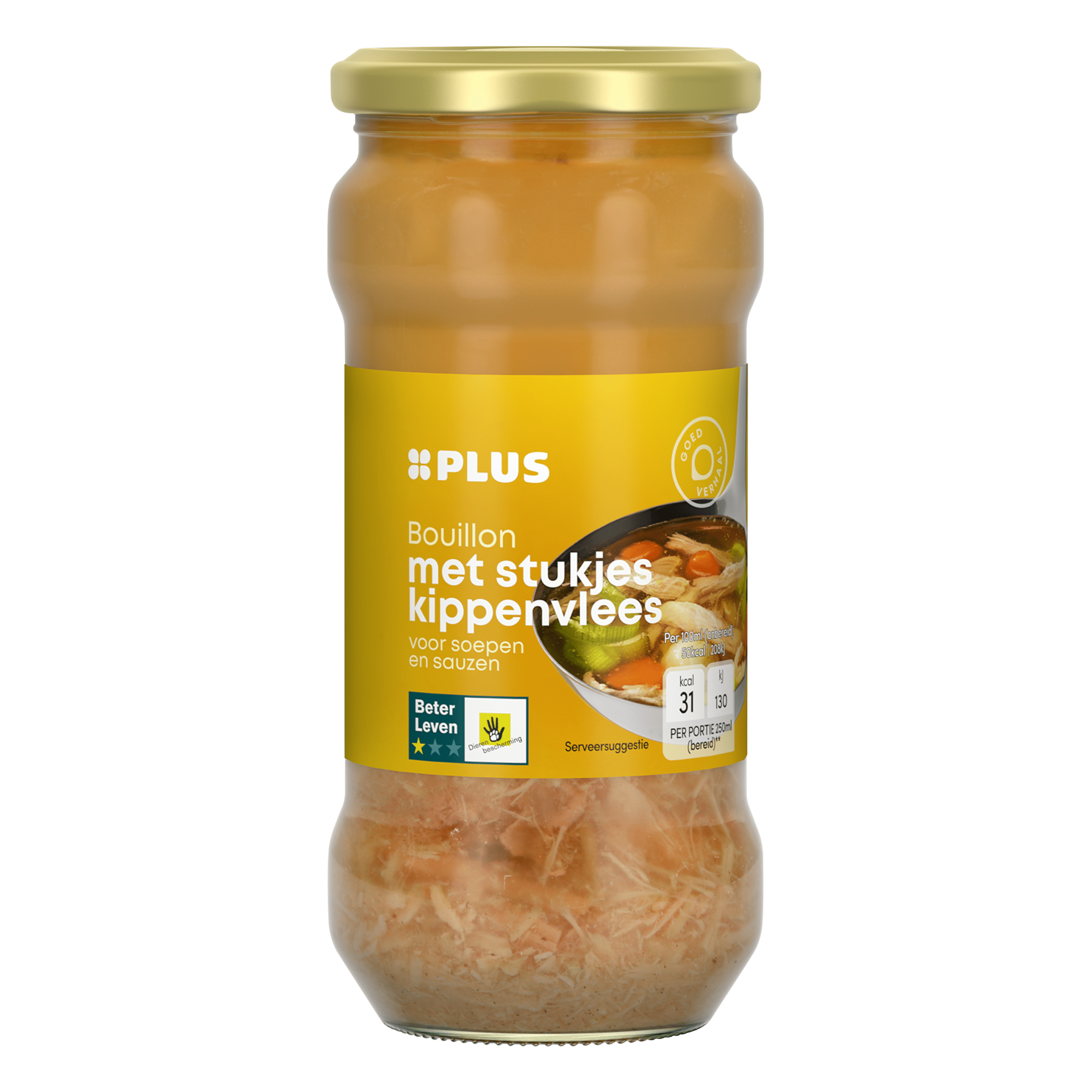 Geniet van de rijke smaak van de PLUS Bouillon kip, bereid op traditionele wijze met kippenvlees van de Beter Leven 1 Ster kwaliteit. Deze geconcentreerde bouillon is perfect als basis voor een heerlijke kippensoep. Verdun de bouillon eenvoudig met water en breng het al roerend aan de kook voor een snel en smakelijk resultaat. Na openen bewaren in de koelkast.
