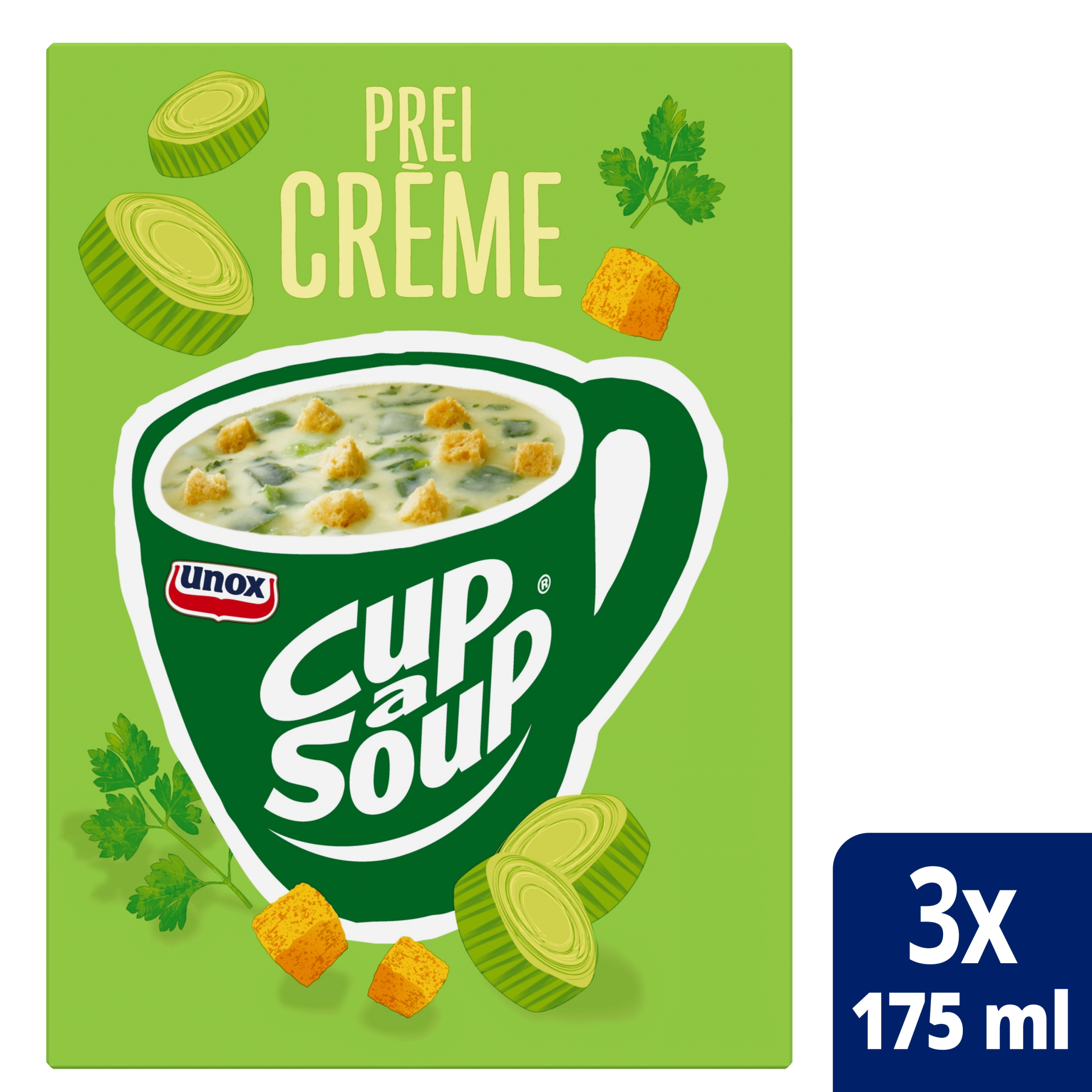 Verwen jezelf met de heerlijke Unox Cup-a-Soup Prei Crème! Deze makkelijke en smakelijke soep maak je in een handomdraai klaar. Elke verpakking bevat 3 zakjes, met elke zak goed voor een romige, hartige mok soep boordevol prei en knapperige croutons. Met slechts 65 calorieën per mok en zonder kunstmatige toevoegingen, is het de ideale snack voor een drukke dag. Perfect te genieten thuis of op kantoor. Een simpel en snel tussendoortje dat je weer energie geeft!