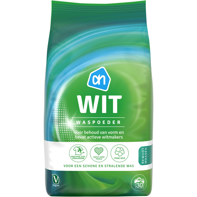 AH Waspoeder Wit is speciaal ontwikkeld voor de verzorging van je witte was. Dit krachtige wasmiddel bevat actieve witmakers die zorgen voor een stralend resultaat, zelfs bij lage temperaturen van 20 of 30 graden. Met ruim 30 wasbeurten per verpakking biedt dit waspoeder een voordelige en efficiënte oplossing voor een frisse en schone was. Combineer het met onze wasverzachters voor een extra zachte touch en een heerlijke geur. Was bewust, was wit!