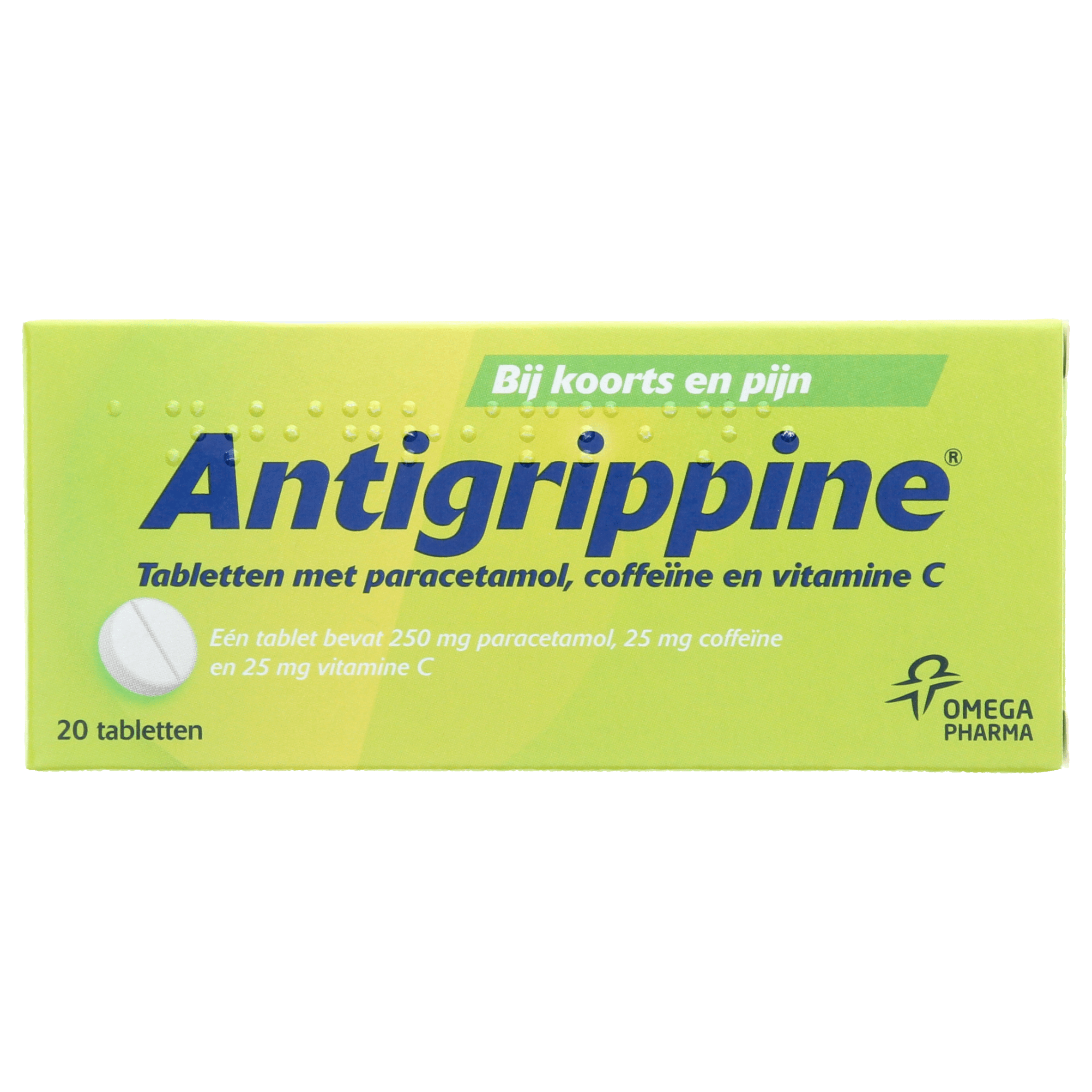 Eén tablet bevat 250 mg paracetamol, 25 mg coffeïne en 25 mg vitamine C.