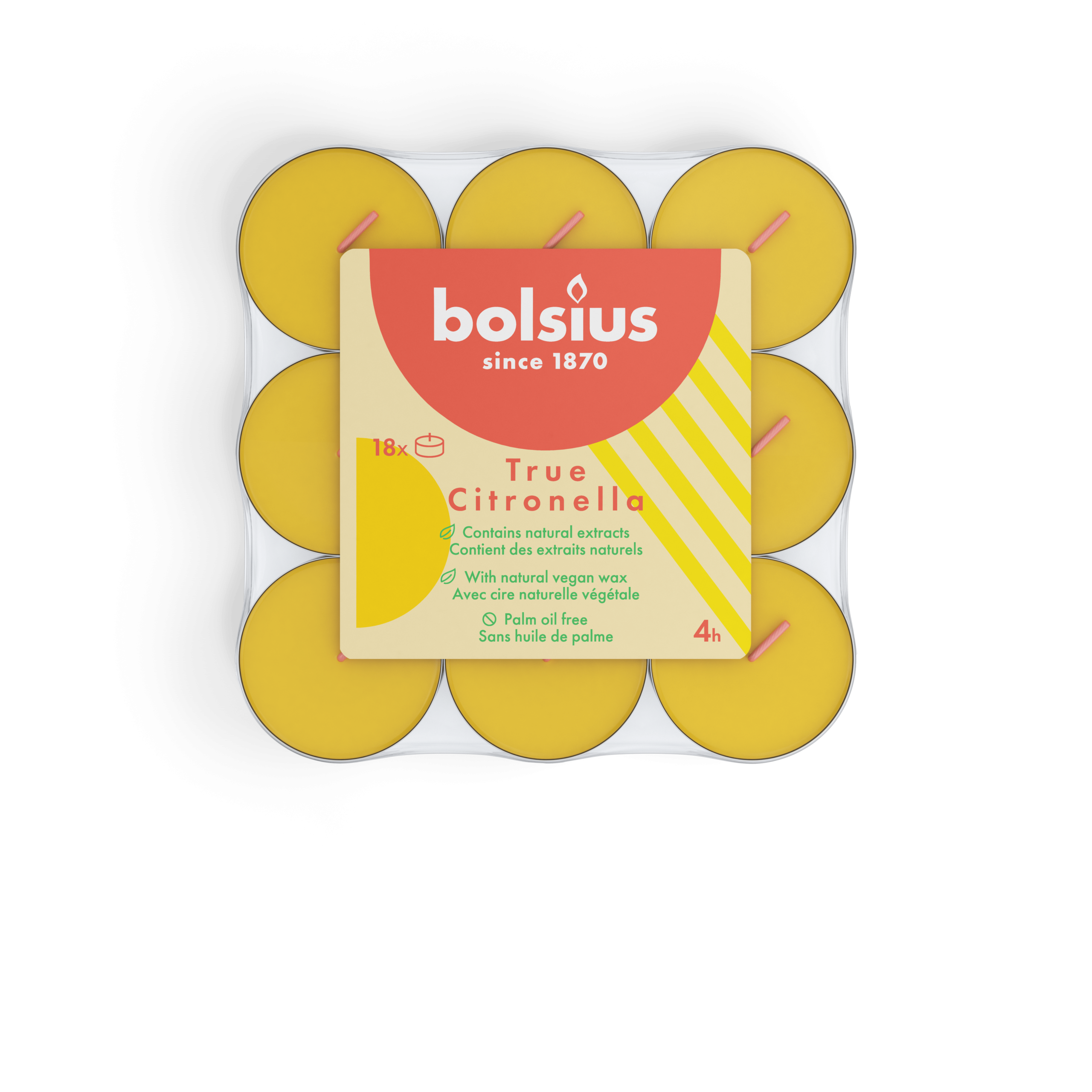 Geniet van de verfrissende geur van Bolsius Geurtheelichten True Citronella. Deze geurtheelichten in een aluminium cup bieden een frisse citroengeur en zijn gemaakt van hoogwaardige grondstoffen en natuurlijke extracten. Dankzij het gebruik van topkwaliteit paraffine roken en smeulen de theelichten niet, waardoor je tot wel 4 uur lang kunt genieten van de heerlijke geur.
