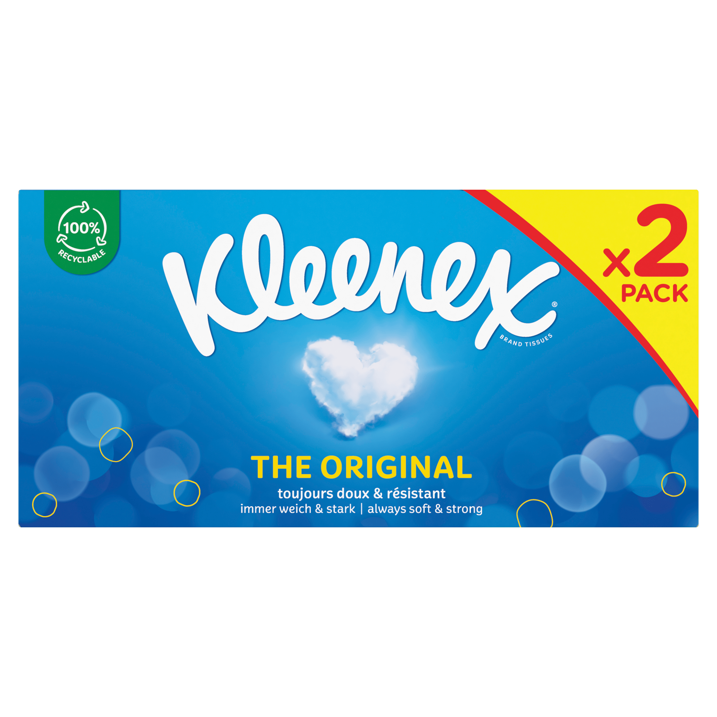 Kleenex The Original tissues zijn de ideale keuze voor dagelijks gebruik door het hele gezin. Ze zijn zacht voor de huid, maar tegelijkertijd sterk genoeg voor alle situaties. Deze duo-box bevat 2 pakjes van 72 tissues, waardoor je altijd voorzien bent van een tissue wanneer je hem nodig hebt. Ook verkrijgbaar als handige zakdoekjes.