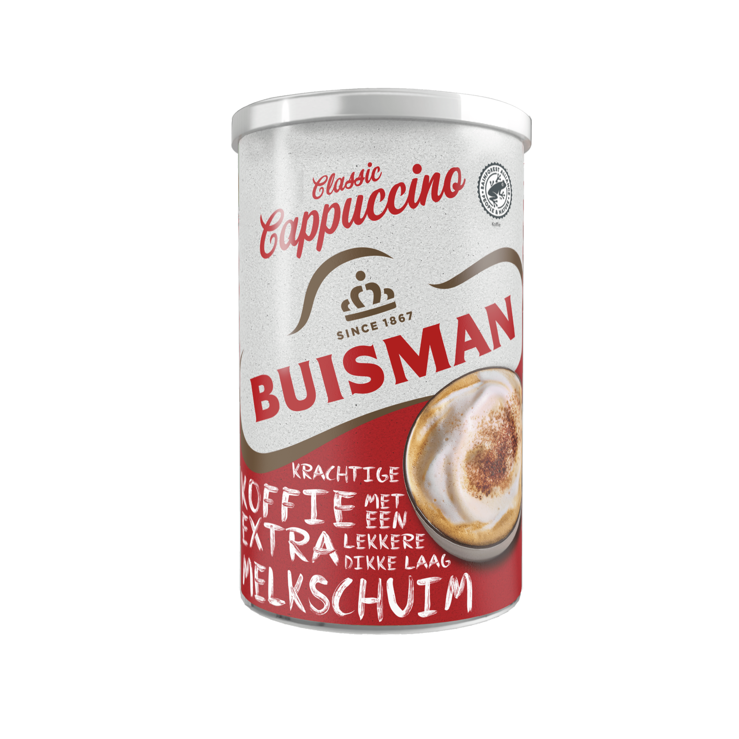 Geniet van een moment van luxe met Buisman Cappuccino. Deze instant cappuccino met rijke smaken van oploskoffie en magere melkpoeder laat je in een handomdraai een heerlijk warme drank bereiden. Perfect voor die momenten waarop je even wilt ontspannen of vrienden wilt verrassen. Simpel te bereiden; voeg heet water toe, roer, en je hebt binnen een minuut een koninklijke cappuccino. Rainforest Alliance gecertificeerd, met zorg voor mensen en natuur.