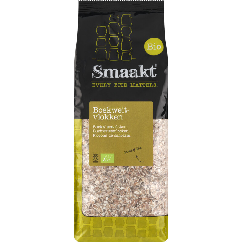 Smaakt Boekweitvlokken zijn een heerlijke, voedzame en biologische keuze. Deze vlokken zijn een uitstekende bron van vezels en perfect als ontbijtbasis. Geniet van de rijke smaak door ze te combineren met melk of yoghurt, of kook ze als een gezonde pap. Van gecontroleerde biologische teelt, zijn deze boekweitvlokken ook nog eens recyclebaar.
