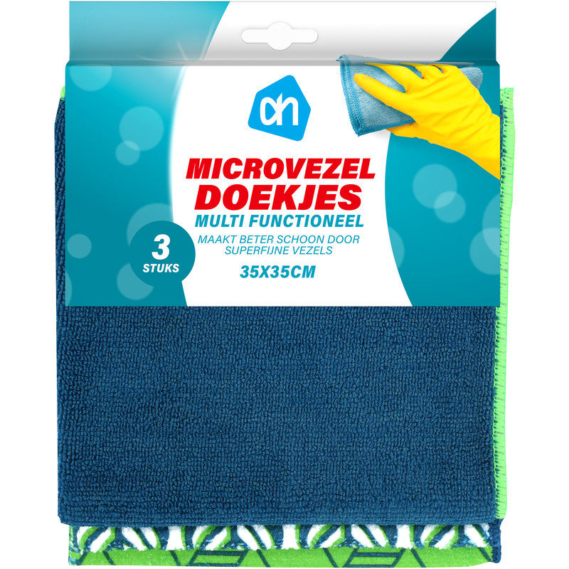 Maak schoonmaken eenvoudiger en efficiënter met de AH Microvezeldoekjes. Deze set bevat drie hoogwaardige doekjes; één in uni-kleur en twee met een leuke print. Geschikt voor alle oppervlakken, maken deze microvezeldoekjes schoon zonder dat je schoonmaakmiddel hoeft te gebruiken. Dankzij de unieke structuur hechten vuil en stof zich moeiteloos aan het doek, waardoor je snel en grondig kunt schoonmaken.