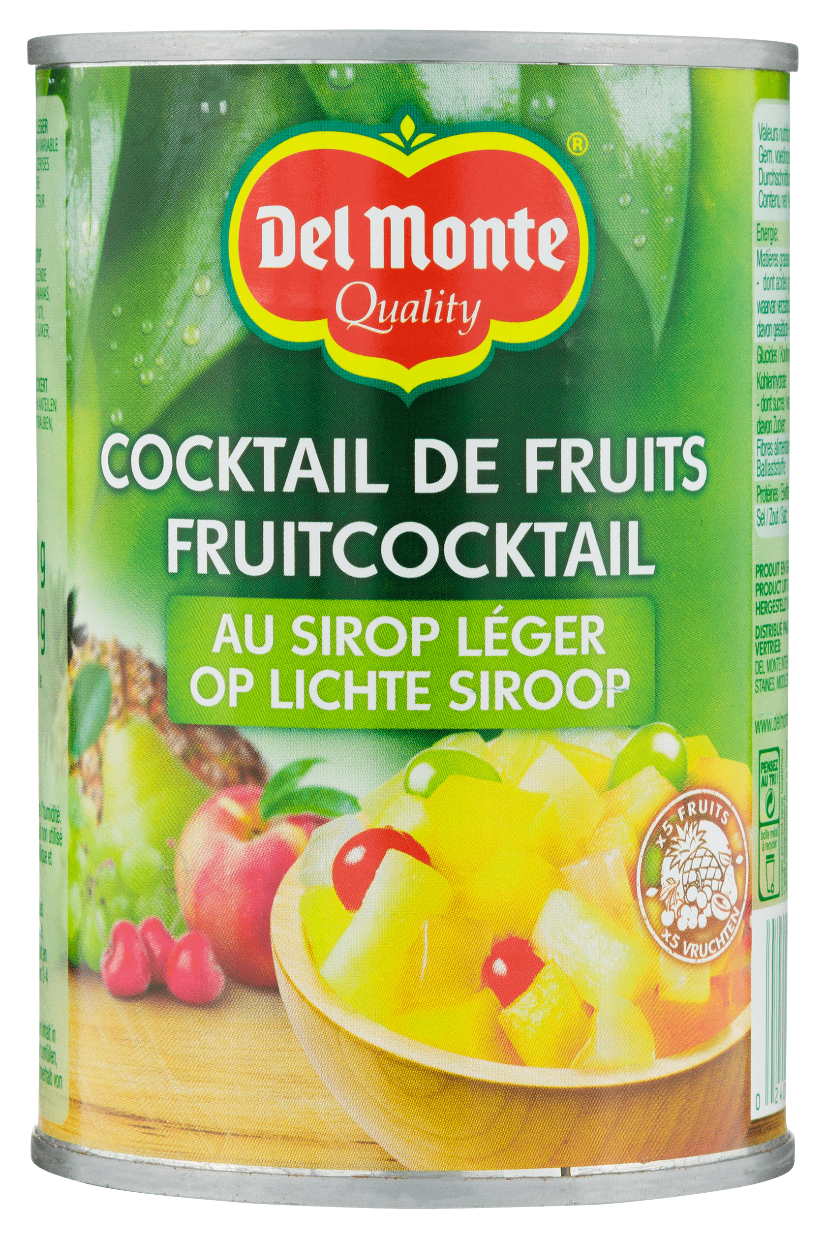 Geniet van de zoete en frisse smaken van de Del Monte Fruitcocktail op siroop. Dit fruitcocktail in blik biedt een heerlijke mix van perziken, peren, ananas, druiven en kersen, perfect voor in desserts of als verfrissend tussendoortje. Bewaar het op een koele, droge plaats en gebruik ongeopende inhoud binnen 3-4 dagen na opening voor de beste kwaliteit.