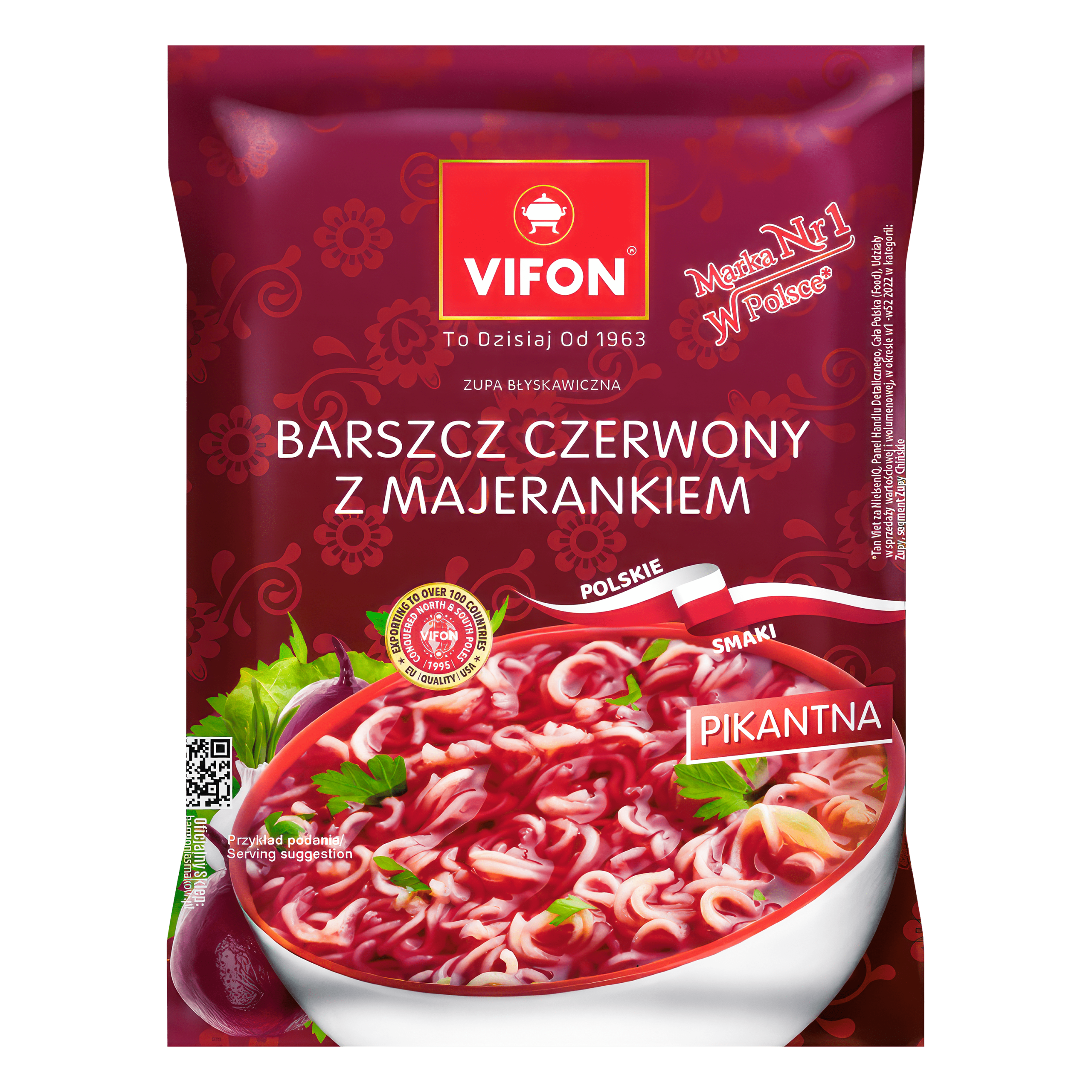 Geniet van de smaakvolle Vifon noedels met rode bietensmaak. Deze noedels zijn eenvoudig te bereiden en vormen een heerlijke en kleurrijke toevoeging aan je maaltijd. Elke wikkel bevat 67 g noedels die je in slechts drie minuten kunt klaarmaken. Een perfecte keuze voor een snelle lunch of als basis voor een voedzame avondmaaltijd.