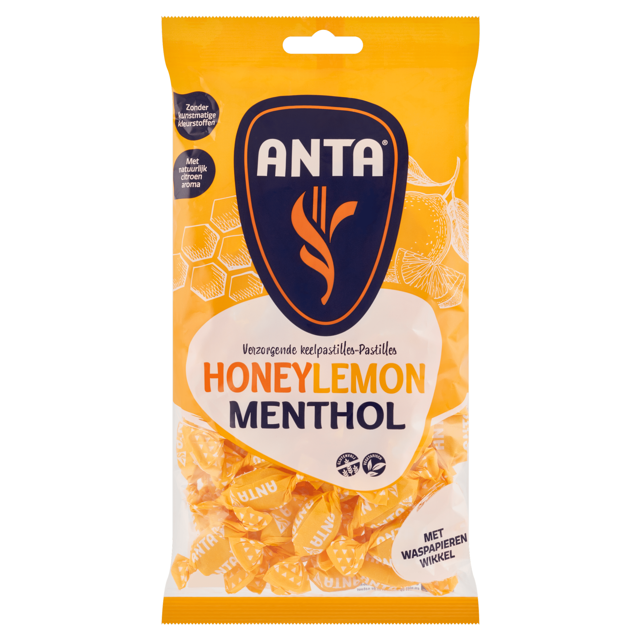 Ontdek de verfrissende ANTA Honing Lemon Menthol keelpastilles, een heerlijke combinatie van honing, citroen en menthol. Deze pastilles zijn vegetarisch, bevatten geen kunstmatige kleurstoffen en zijn verrijkt met natuurlijk citroen aroma. Perfect voor een verfrissende boost bij keelpijn of als tussendoortje, en verpakt in een handige waspapieren wikkel om ze vers te houden.